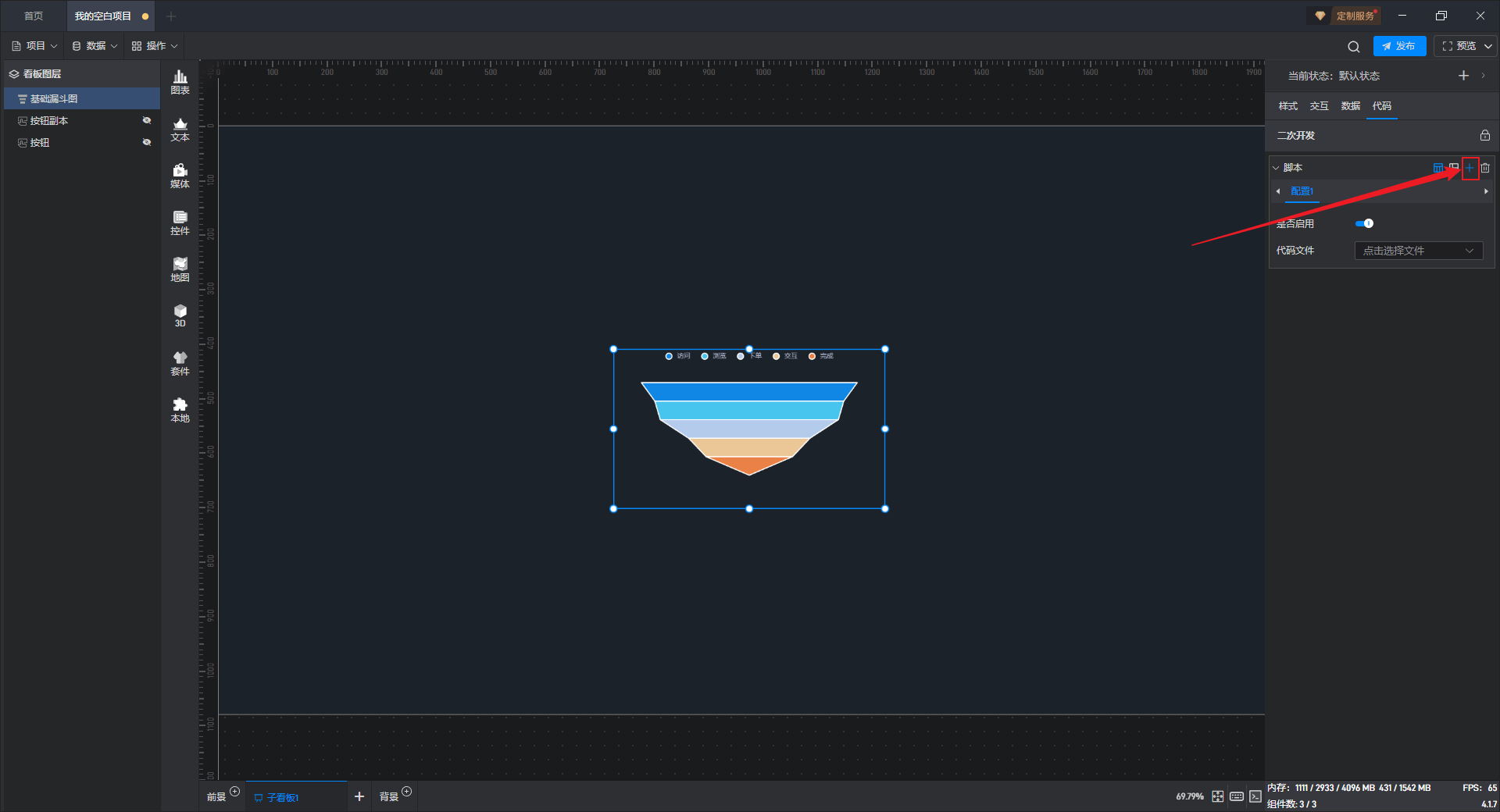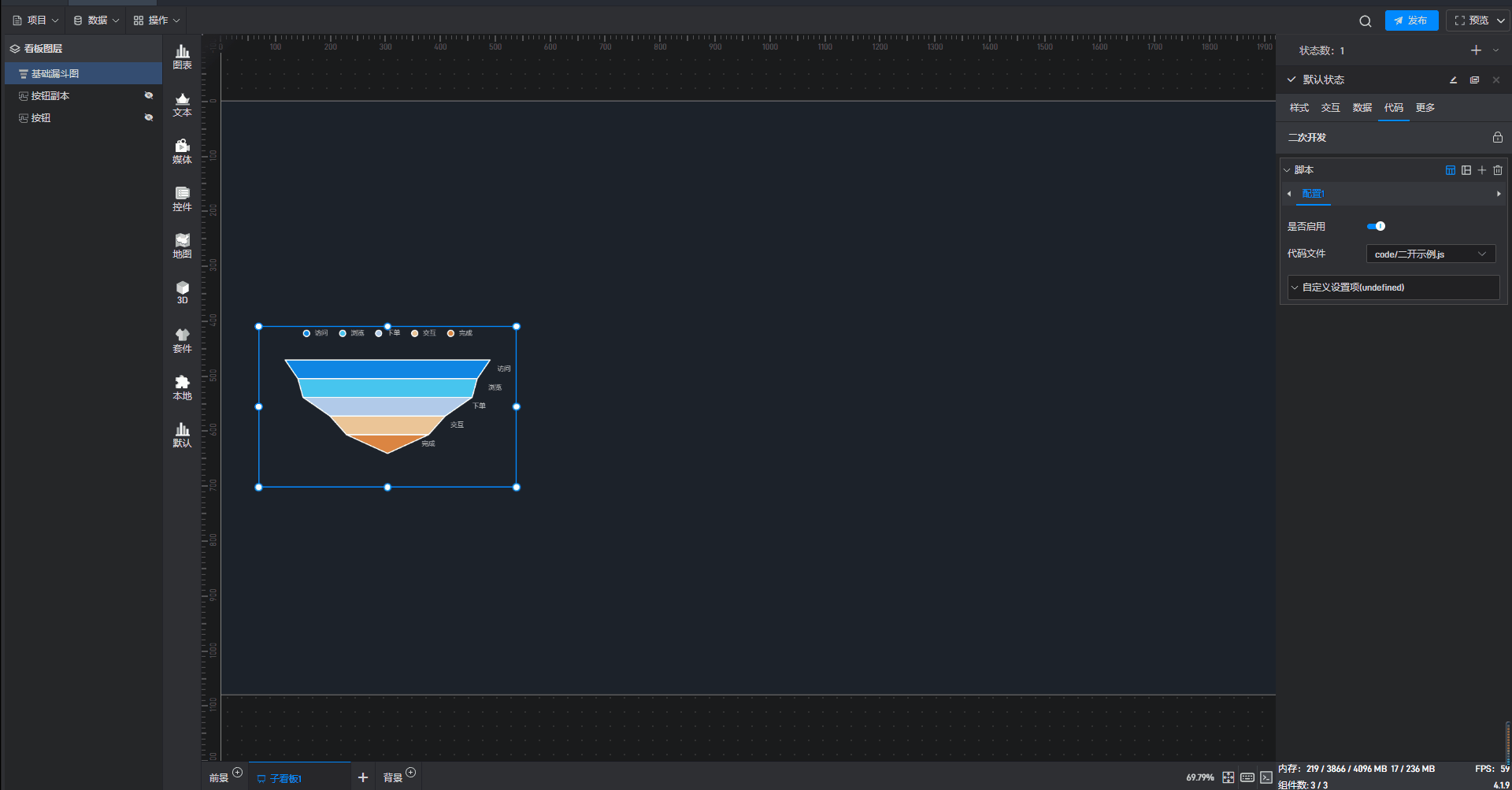 点击选中组件,在右侧“代码”设置窗口中可以对组件进行二次开发设置。