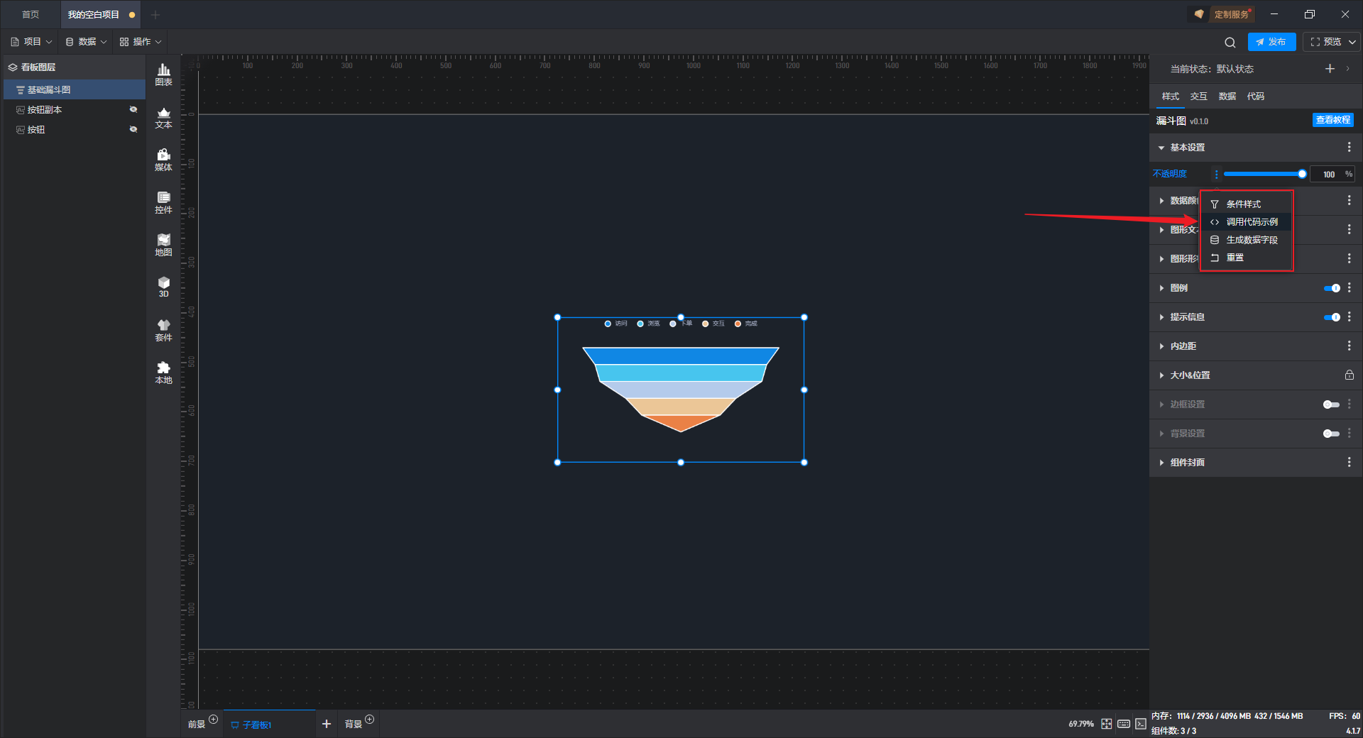 有一些设置项的条件设置方式直接显示在设置项中,这种就可以直接在外面设置,但基础漏斗图的条件样式只能通过方式 1 进行设置。