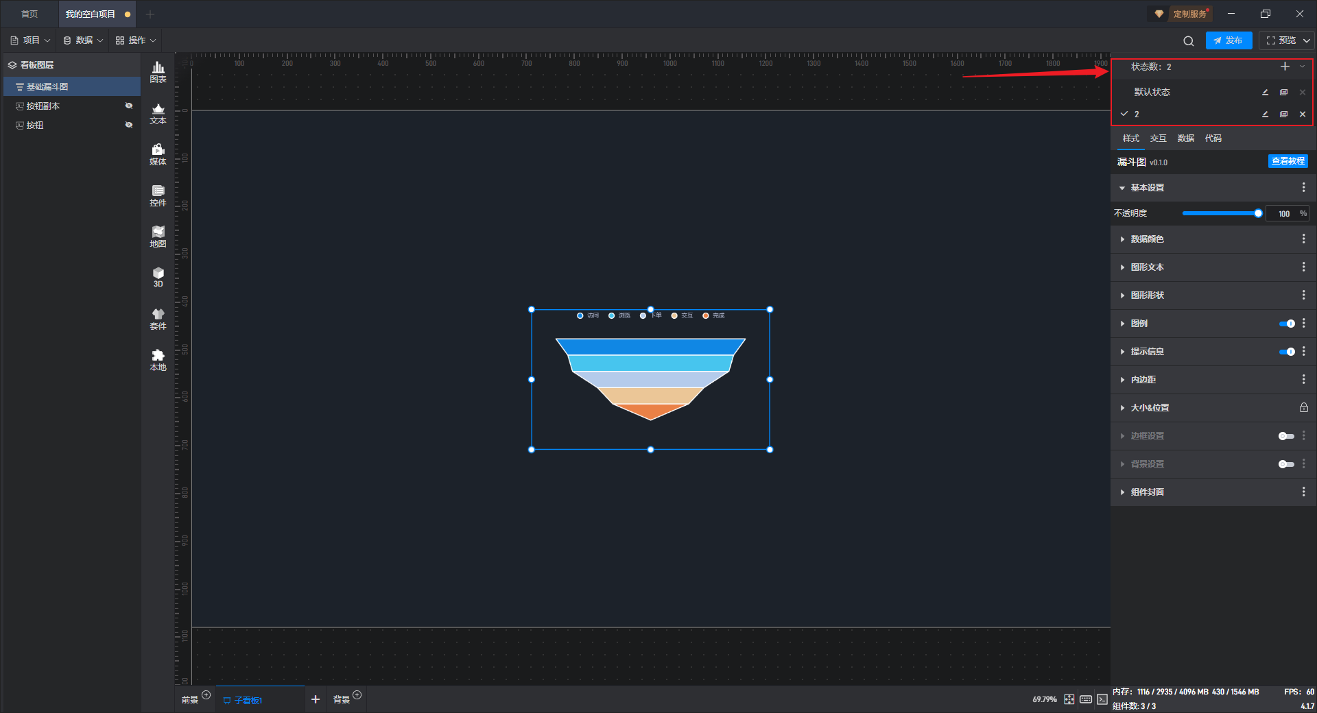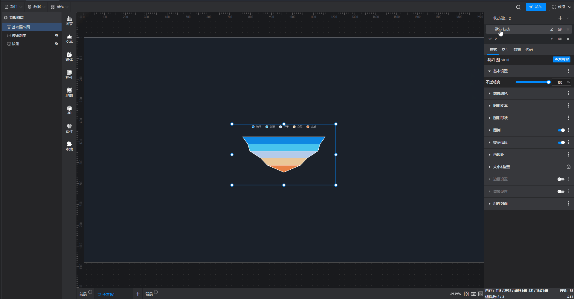 多状态主要用于通过数据条件或是点击交互(通常是点击其他组件来触发本组件的状态切换)来切换组件设置项的场景,这里的设置项包括组件的样式、交互、数据和代码。