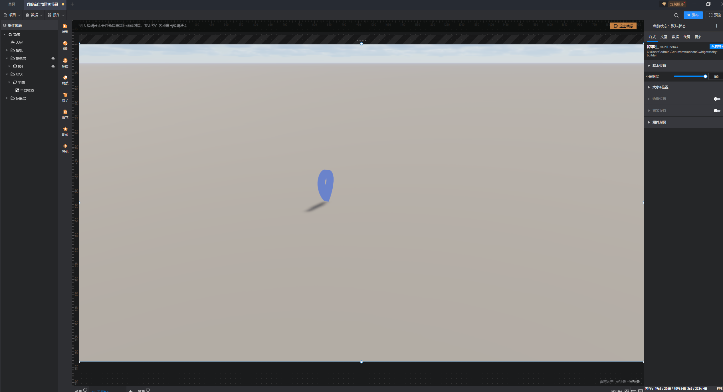 在山海鲸中按“新建-3D 数字孪生-空白地面 3D 场景-创建项目”的顺序创建一个项目,然后双击该项目进入鲸孪生编辑模式。