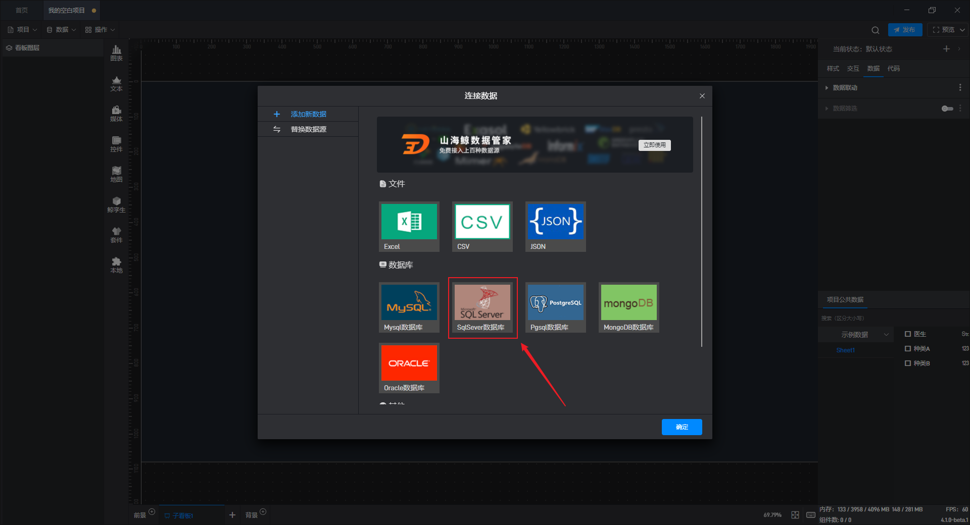 在数据源编辑窗口中,在左侧选择“添加新数据”选项卡,然后在右侧点击数据库分类中的“SQLServer 数据库”选项框。