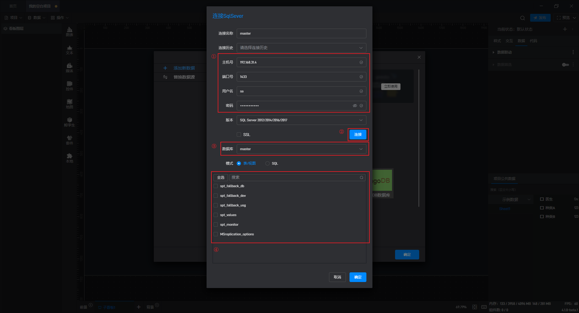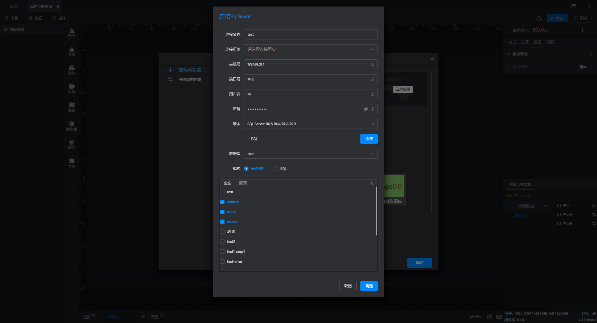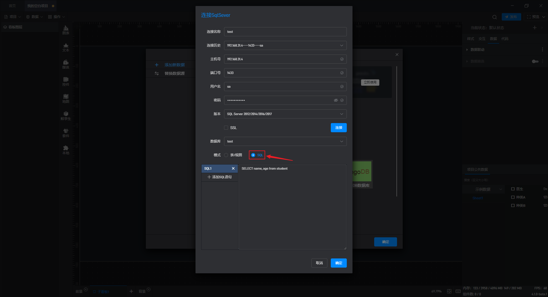 添加数据有两种模式:“表/视图”模式和“SQL”模式。