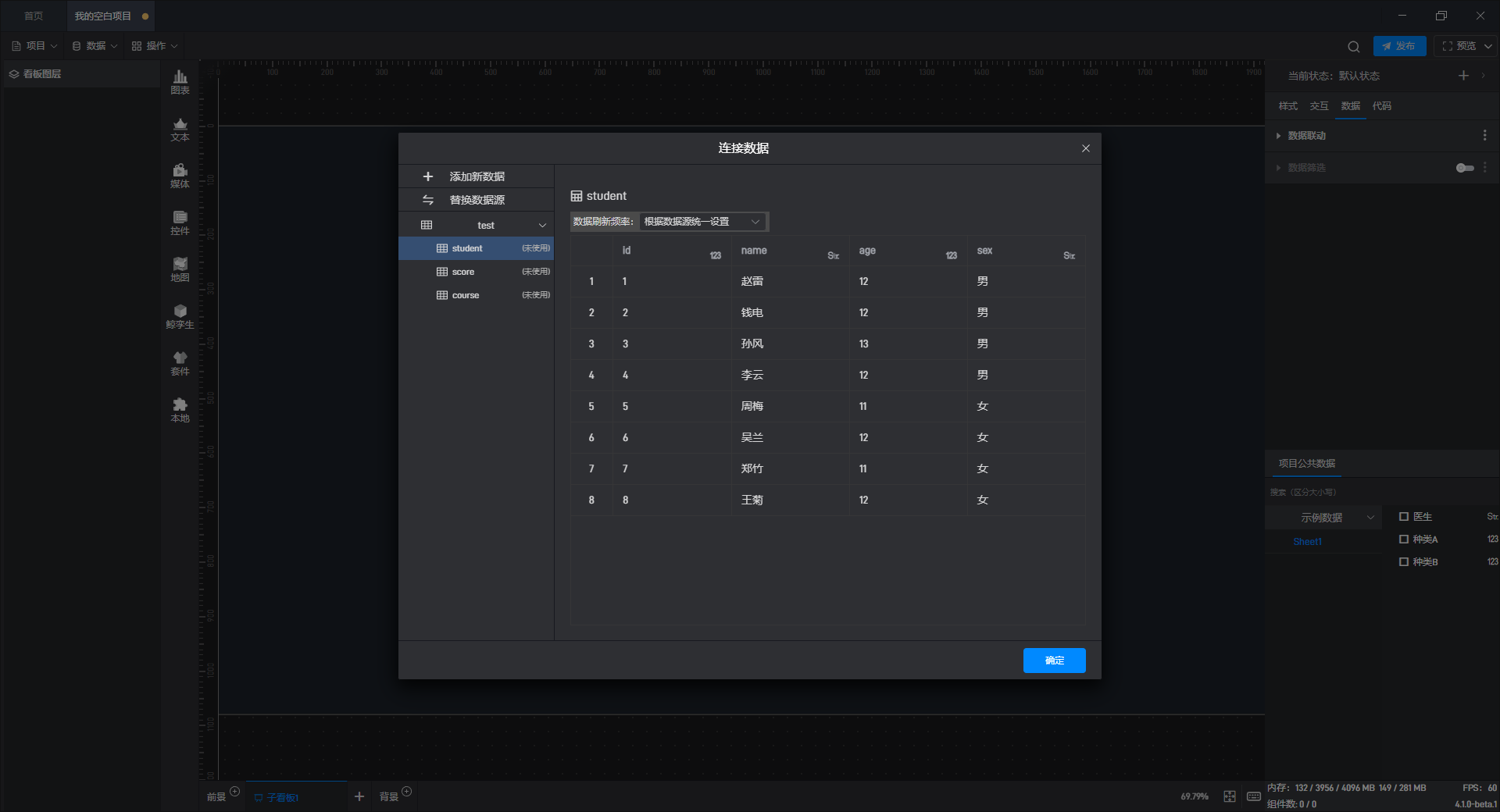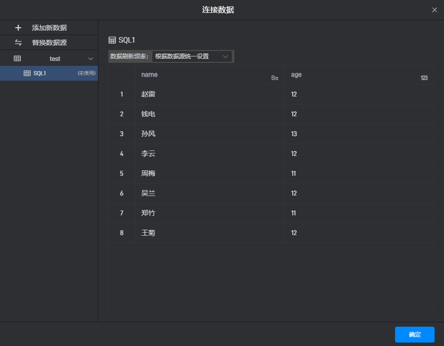 点击“连接”按钮后,在“SQL”模式下点击“+添加 SQL 语句”,输入 SQL 语句“SELECT name, age from student”,然后点击“确定”,就可以进行数据筛选的操作。
