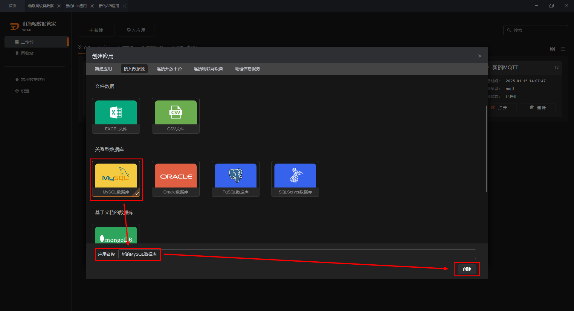 然后我们需要接入用来存储物联网设备数据的数据库,这里使用MySQL 数据库进行演示,在工作台中点击“新建”,选择“接入数据源”,在“接入数据源”弹窗中选择“MySQL 数据库”,在弹窗最下方的输入框中修改“应用名称”,点击“创建”。(点击查看相应教程 →如何接入 MySQL 数据库)