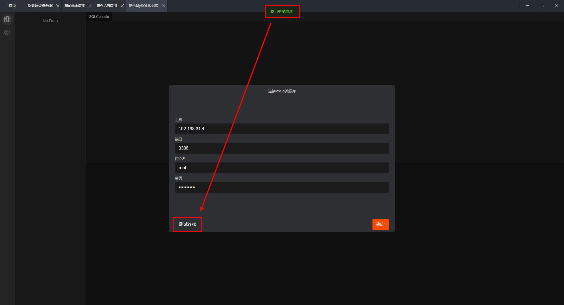 在下方有一个“测试连接”按钮,可以用来测试我们填入的参数信息能否成功连接到数据库。数据库连接测试成功后,点击“确定”。如果测试失败,请检查参数信息是否填写正确,并重复测试连接操作。