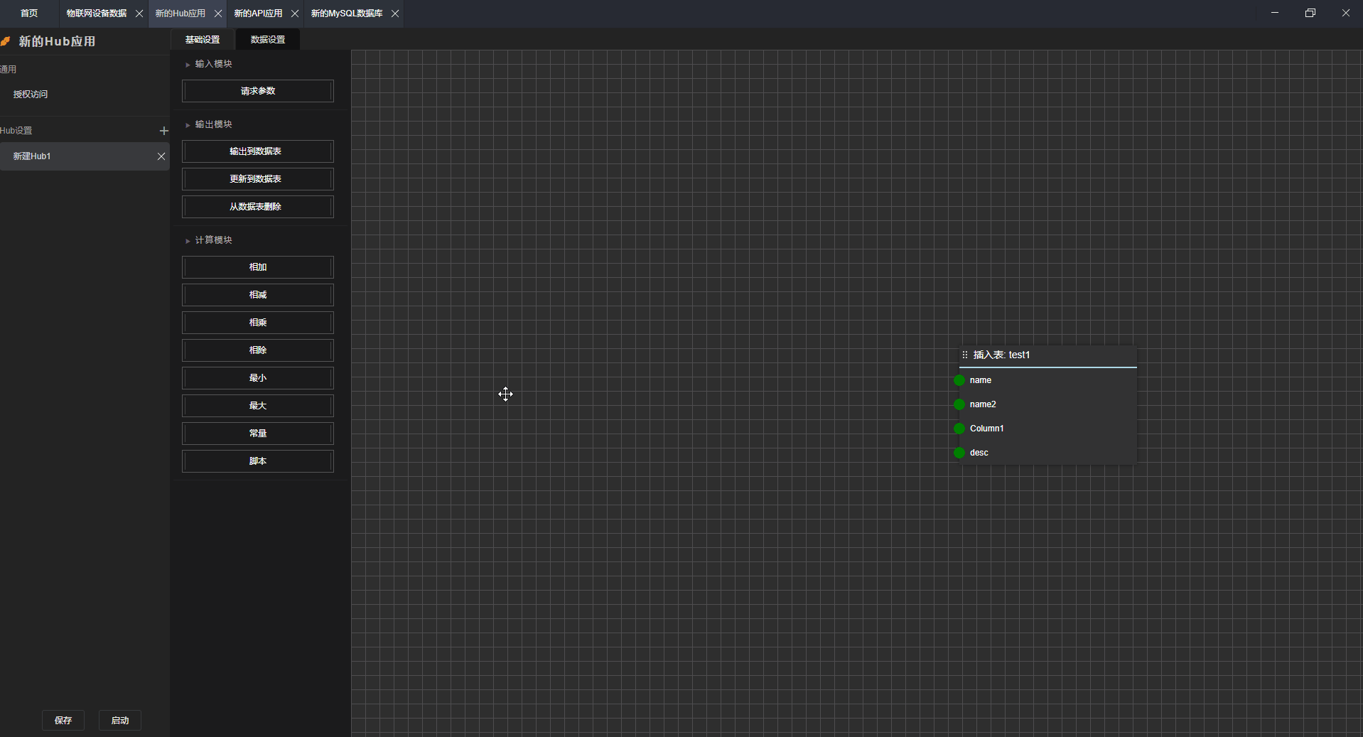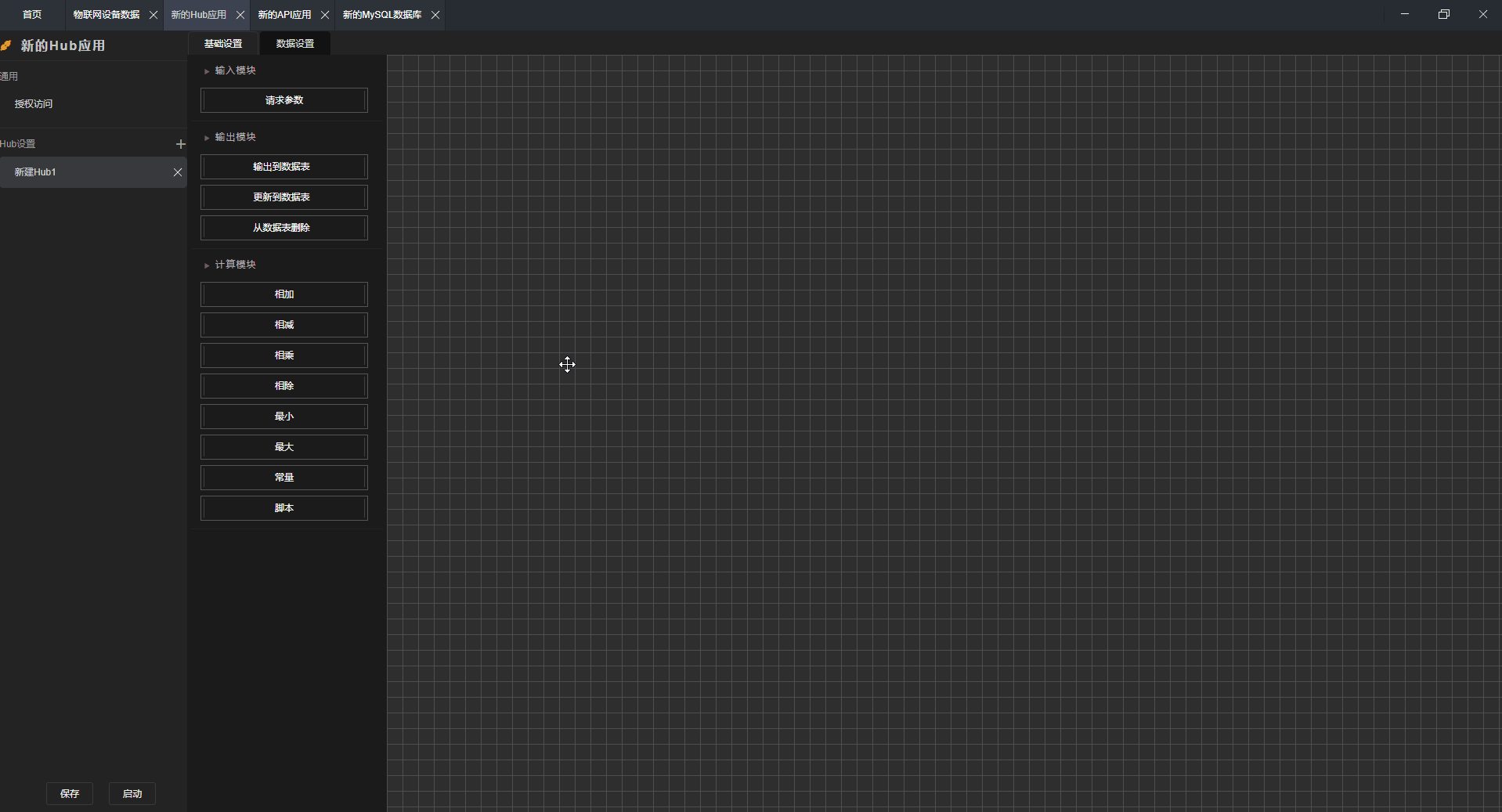 接下来我们需要通过Hub 应用连接 MySQL 数据库,打开 Hub 应用的“数据设置”界面,可以看到“输入模块”、“输出模块”、“计算模块”三个模块板块,如下图所示: