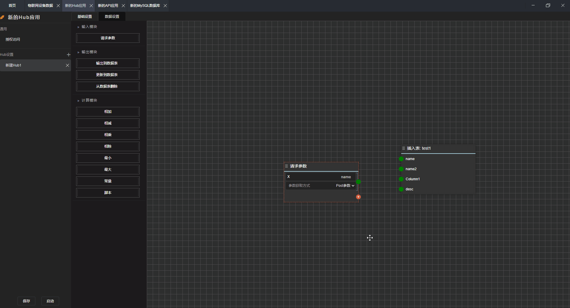 通过鼠标拖拽操作可以将“输出到数据表”模块的字段和“请求参数”模块的对应字段相连接,这样就完成一个将数据存储到 MySQL 数据库的 Hub 应用设置。