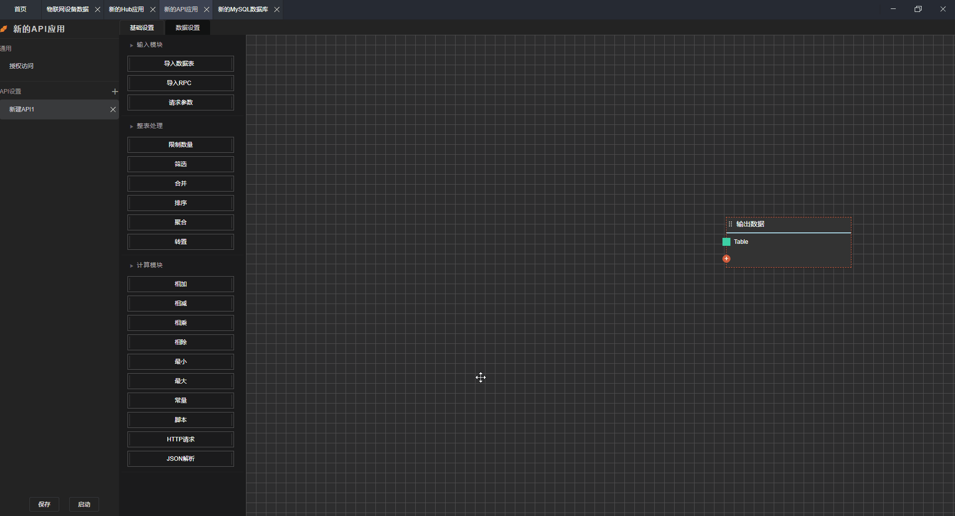 完成 Hub 应用的数据设置后,我们需要使用API 应用来导入 Excel 数据表,打开 API 应用的“数据设置”界面,可以看到“输入模块”、“整表处理”、“计算模块”三个模块板块,下面介绍如何导入 Excel 文件中的物联网设备数据。