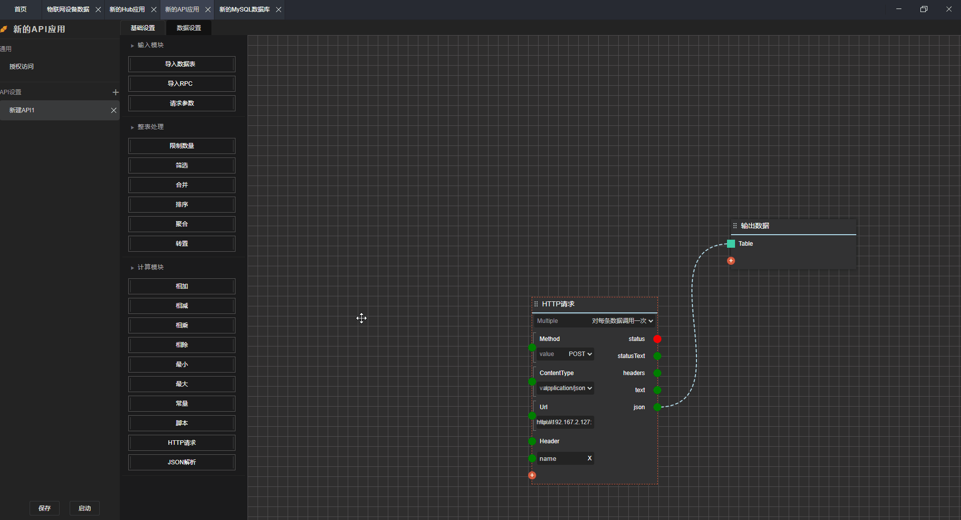 使用鼠标拖拽添加“HTTP 请求”模块至右侧操作界面,使用鼠标拖拽操作连接输出数据中的json,在“url”的输入框里填写要请求的api 地址,也就是之前复制的“Hub 调用地址”,将“Method”更改为“POST”,在下方添加请求参数“name”。