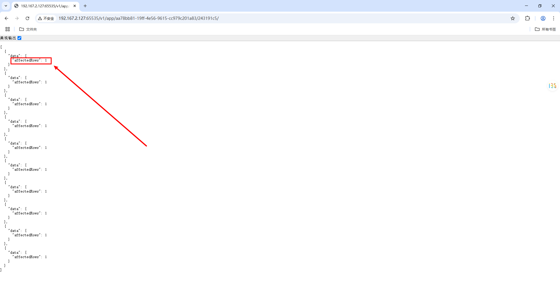 将“API 调用地址”粘贴至浏览器查看输出数据,当“affectedRows”为1时表示输出成功,如下图所示: