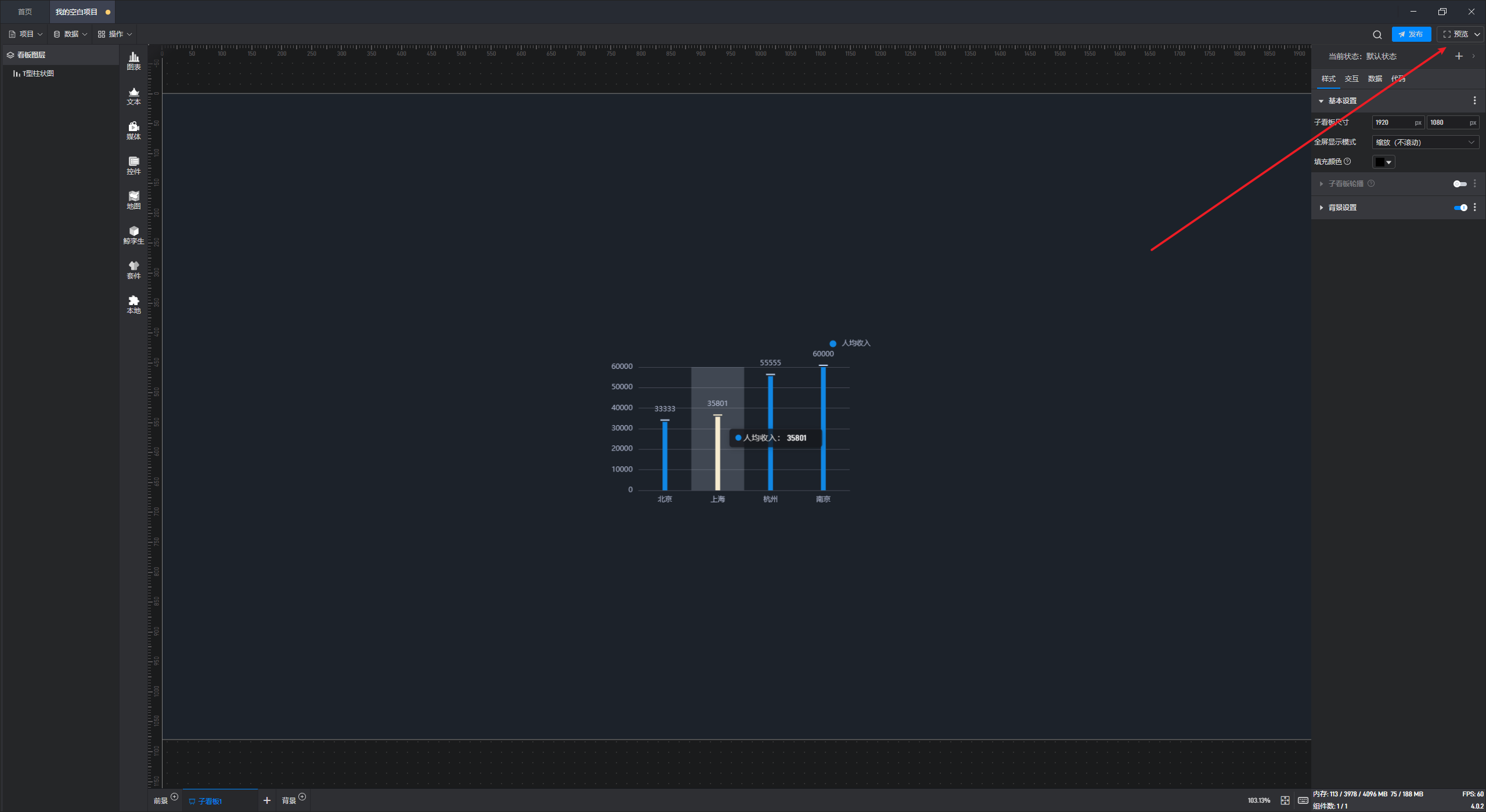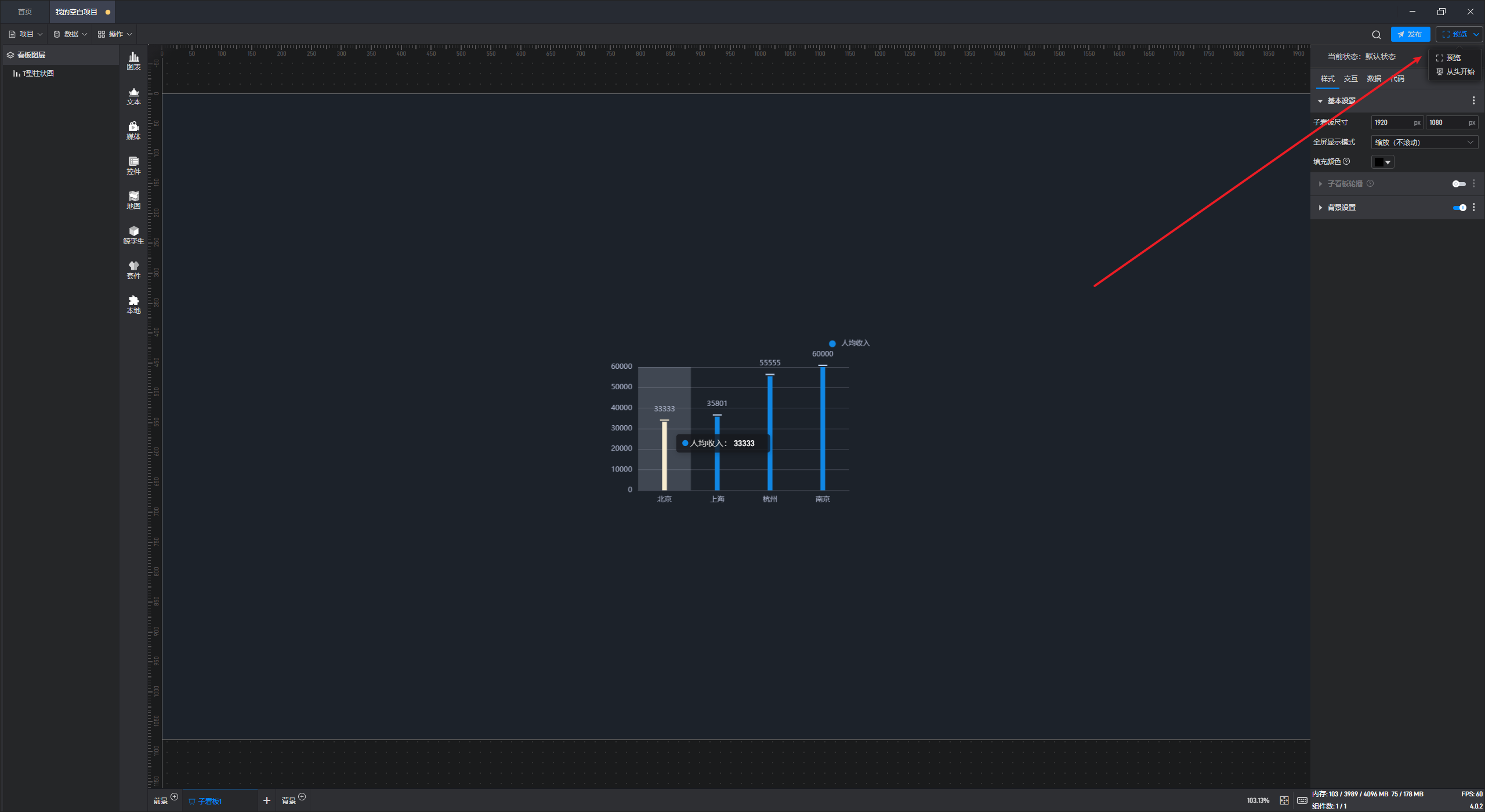 点击编辑界面右上角的“预览”按钮,可以从当前子看板开始预览项目: