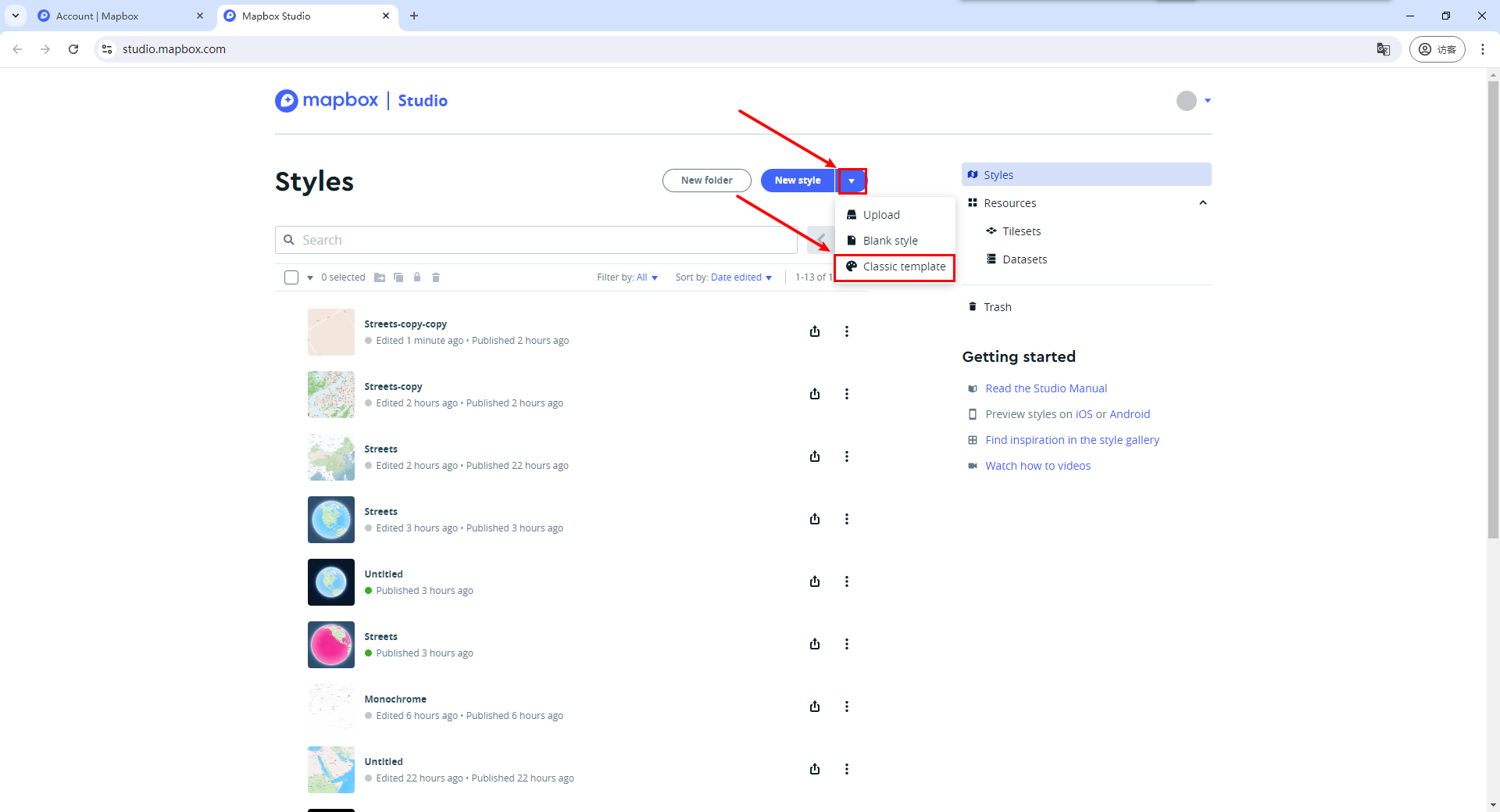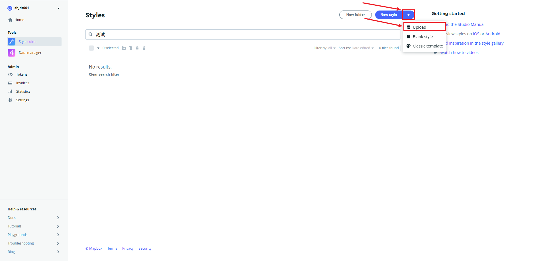 1)在 Mapbox 工作站界面点击“New style”右侧的箭头,然后点击“Upload”按钮。
