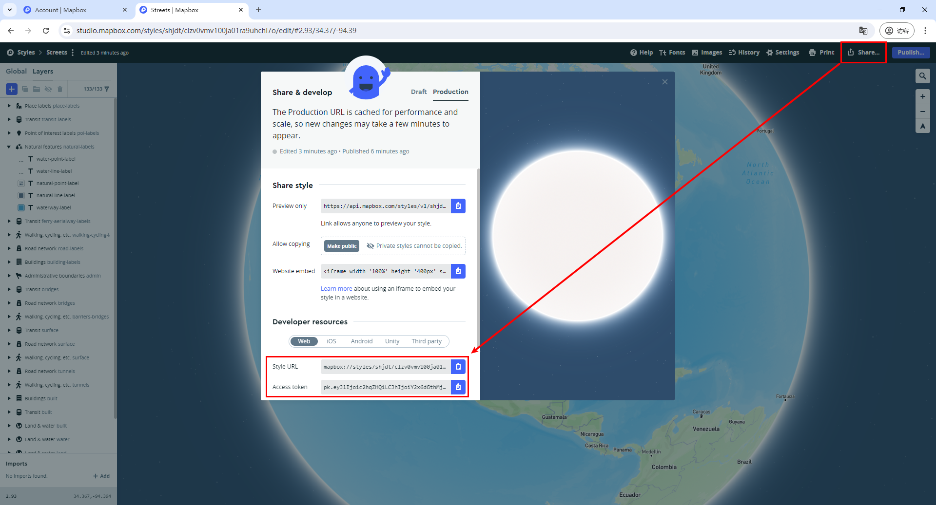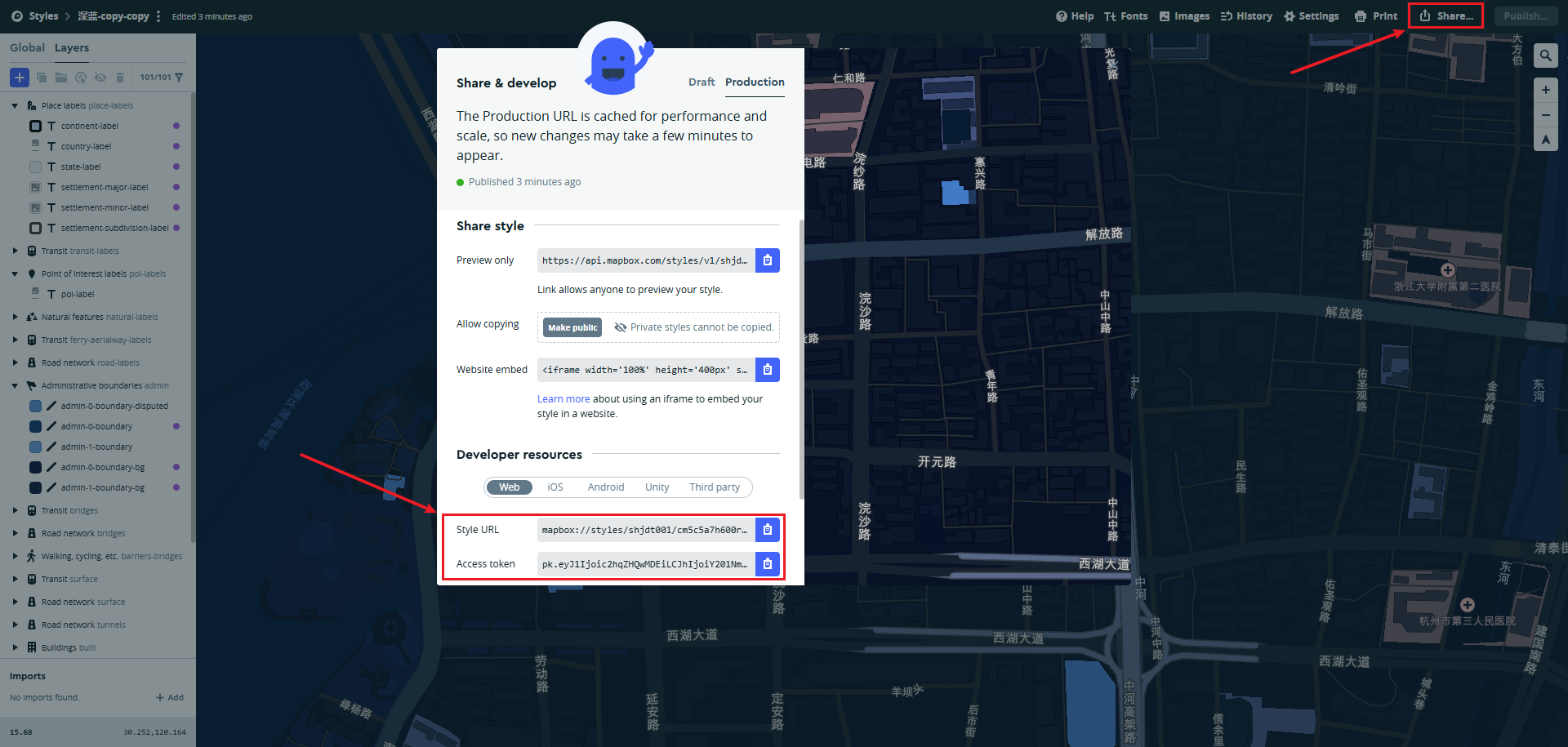 6)点击右上角的“Share”按钮,可以看到窗口中的StyleURL和Access token,点击右侧蓝色按钮即可复制。