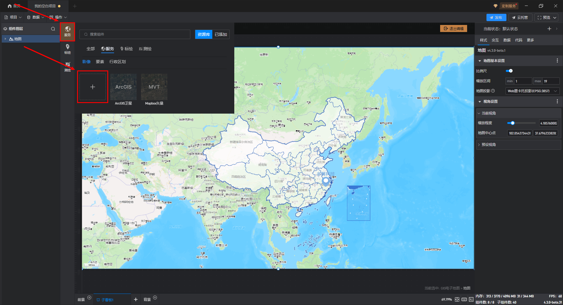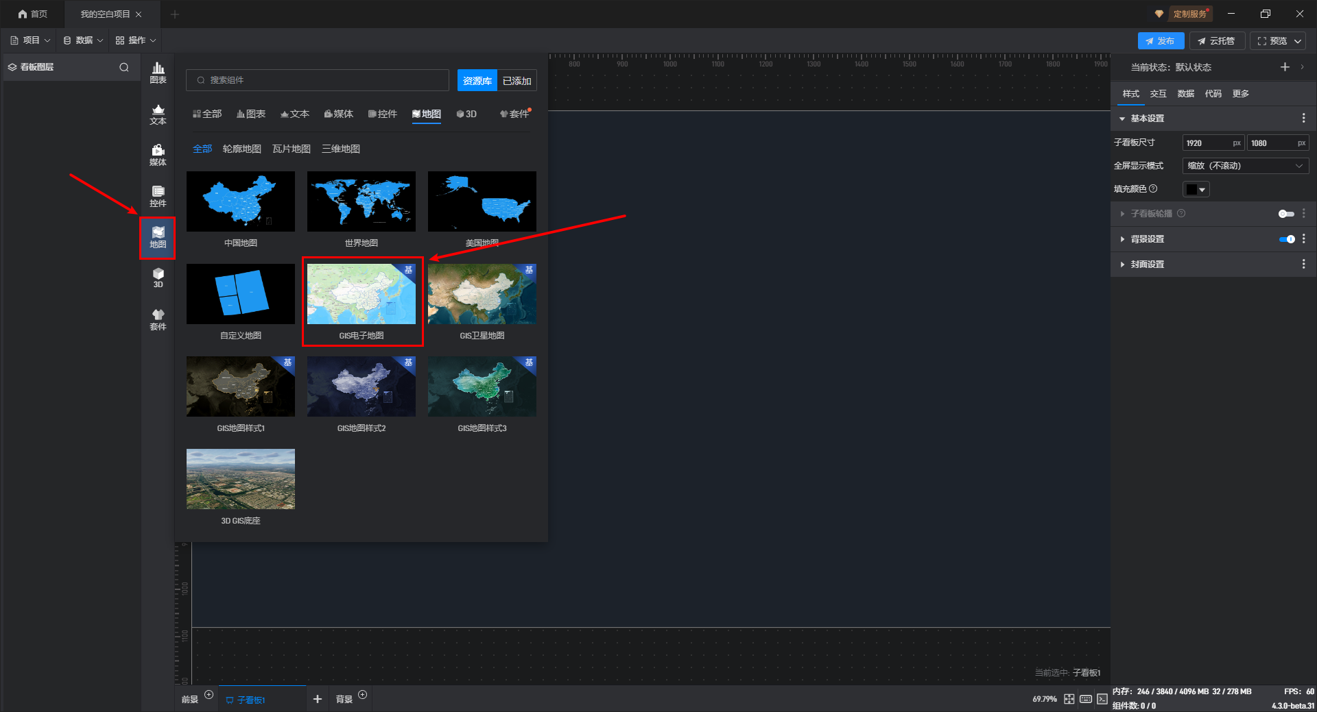 1)打开山海鲸可视化软件,在资源库中找到“地图”类别,在项目中添加一个“GIS 电子地图”组件。