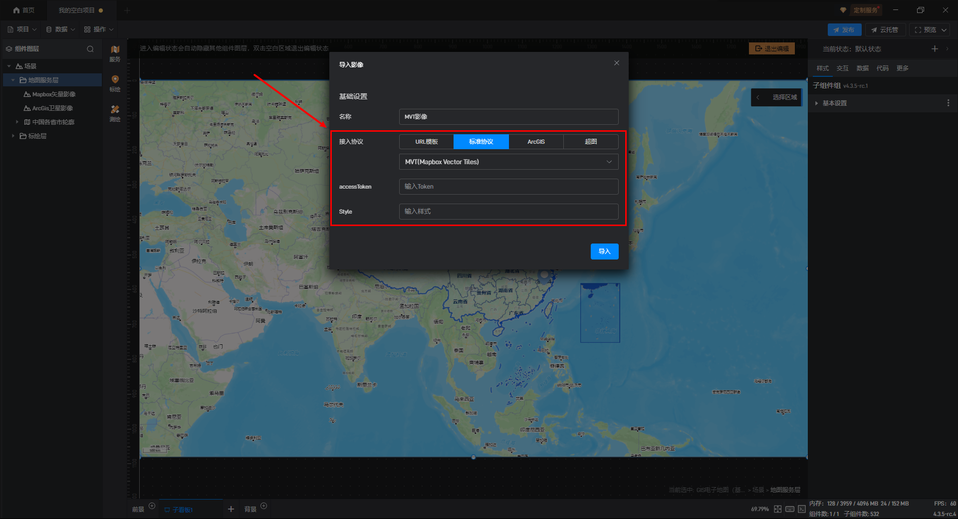 3)影像类型选择“标准协议-MVT(Mapbox Vector Tiles)”,在下方的“Access token”和“Style”中填入之前的Access token和StyleURL,点击“导入”。