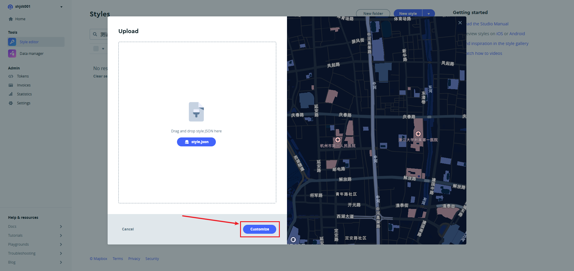 3)上传完毕后,右侧会显示地图样式预览,点击下方“Customlze”按钮即可完成上传。