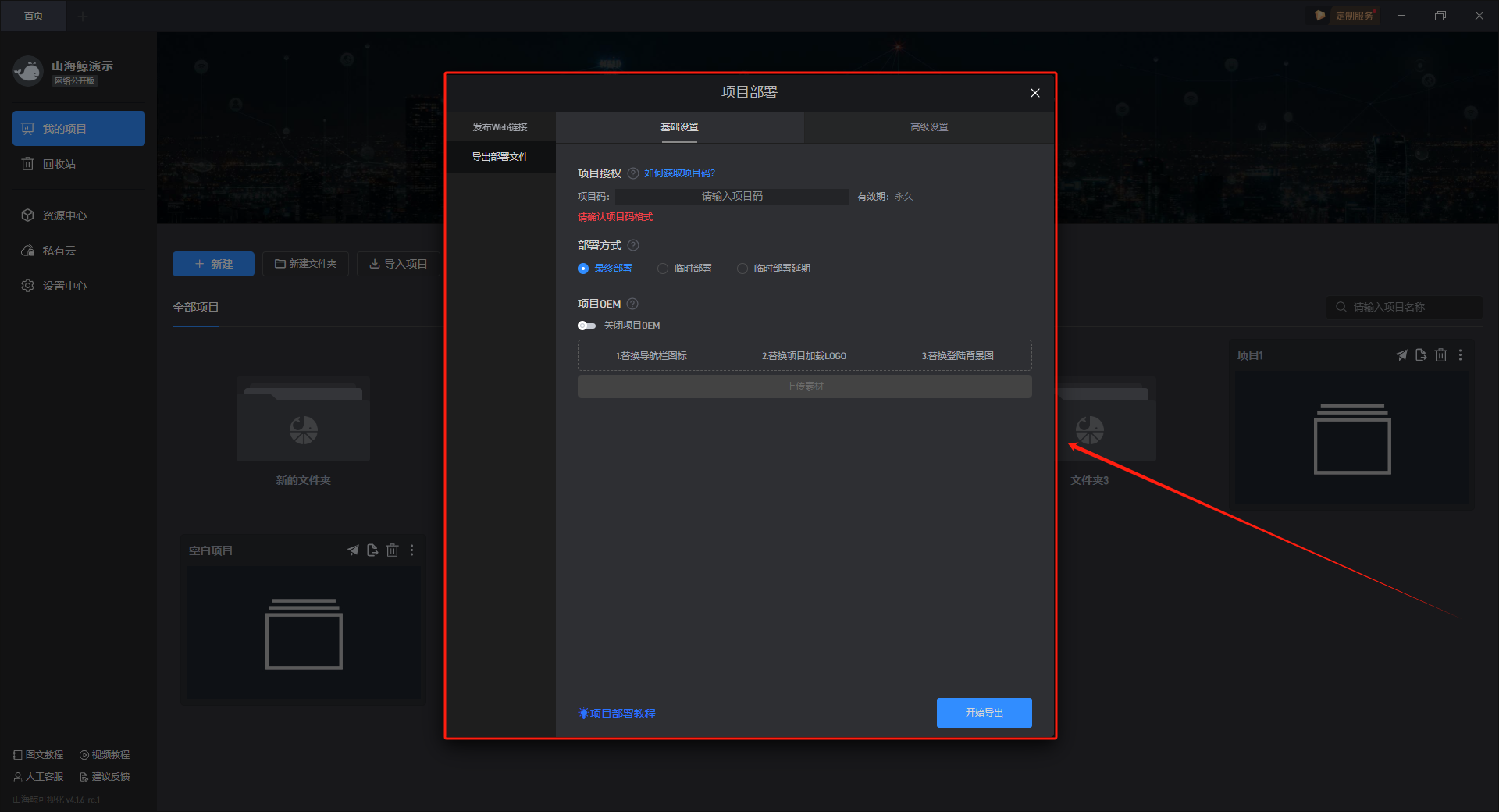 点击发布或导出按钮都可以打开项目部署窗口,然后进行发布链接或导出项目部署文件的设置。