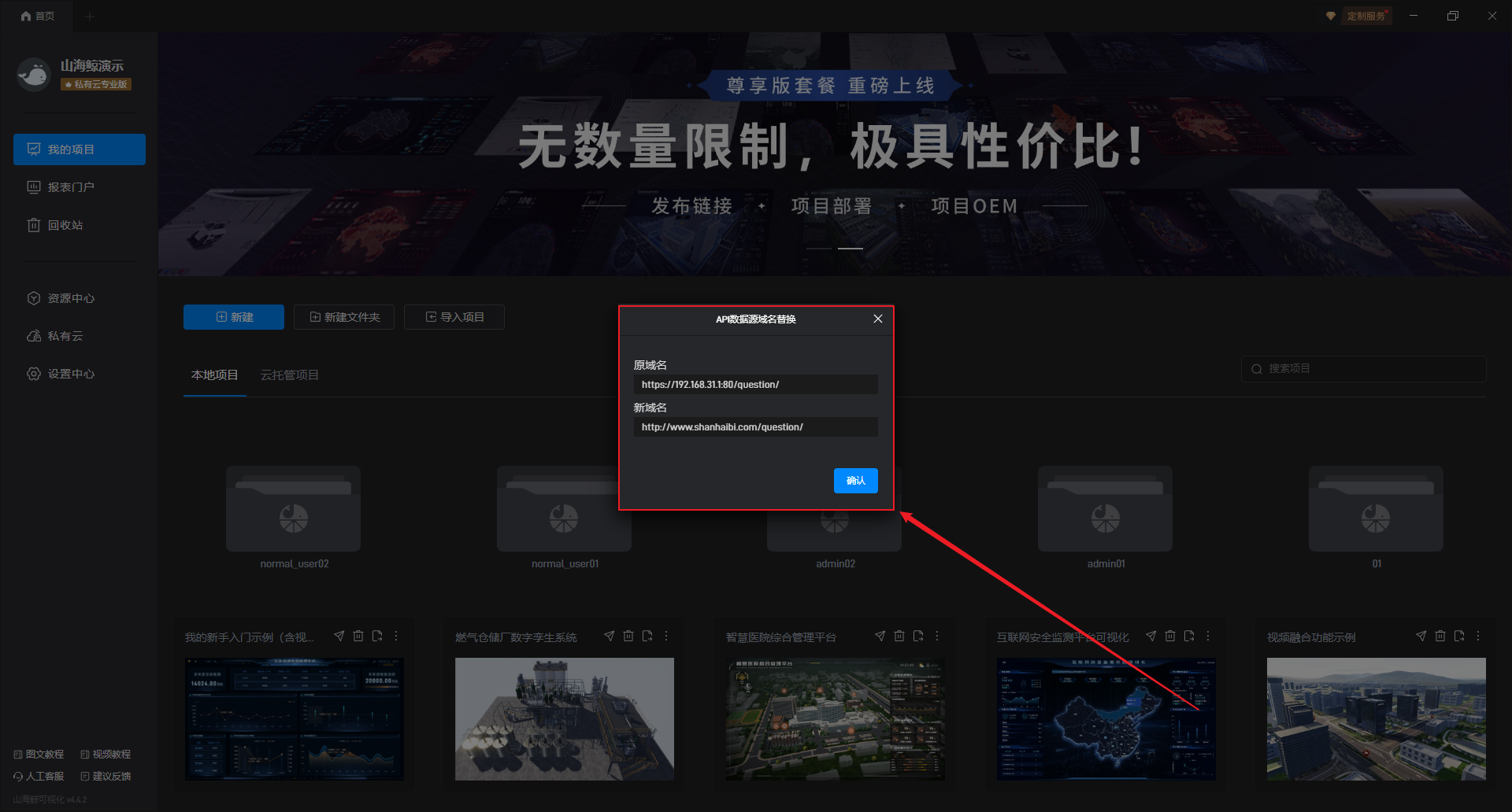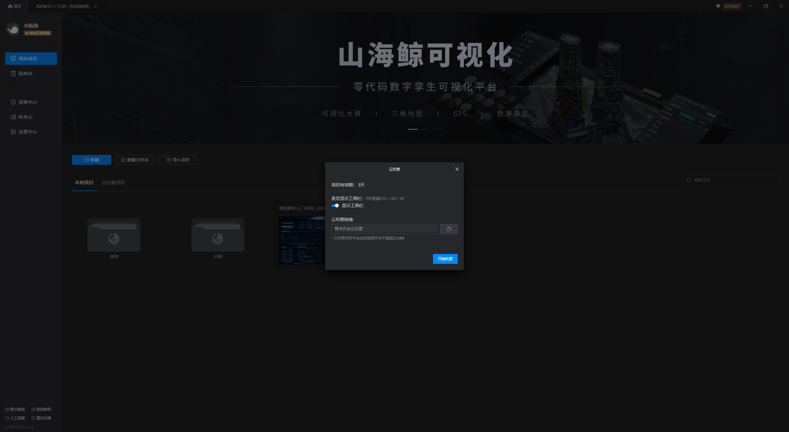 云托管功能主要用于项目的临时演示交付,通过使用云托管功能,可以将项目传输到山海鲸可视化的云服务上,从而得到一个可以在公开网络环境中访问的项目链接(有效期 3 天)。