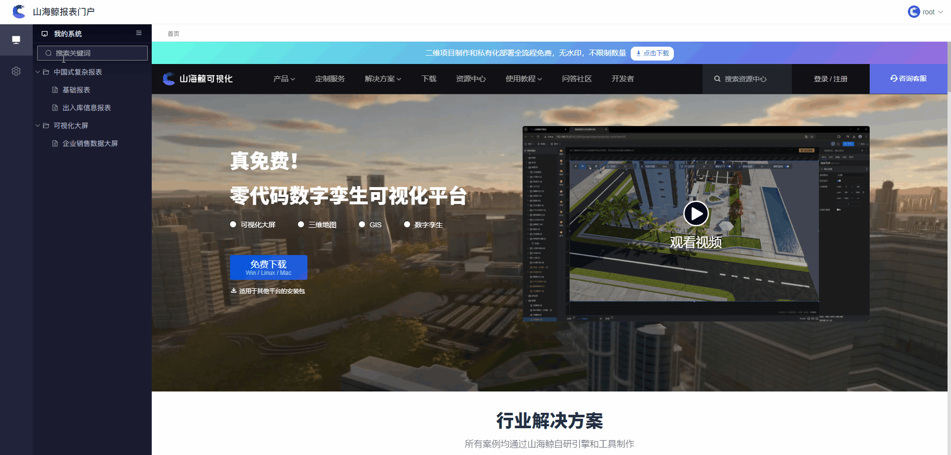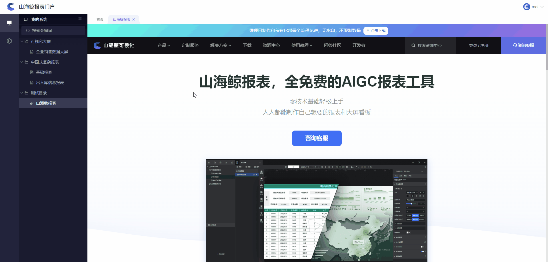 打开“我的系统”界面,左侧目录树中多显示了一个刚刚添加的山海鲸报表官网的链接,如下图所示: