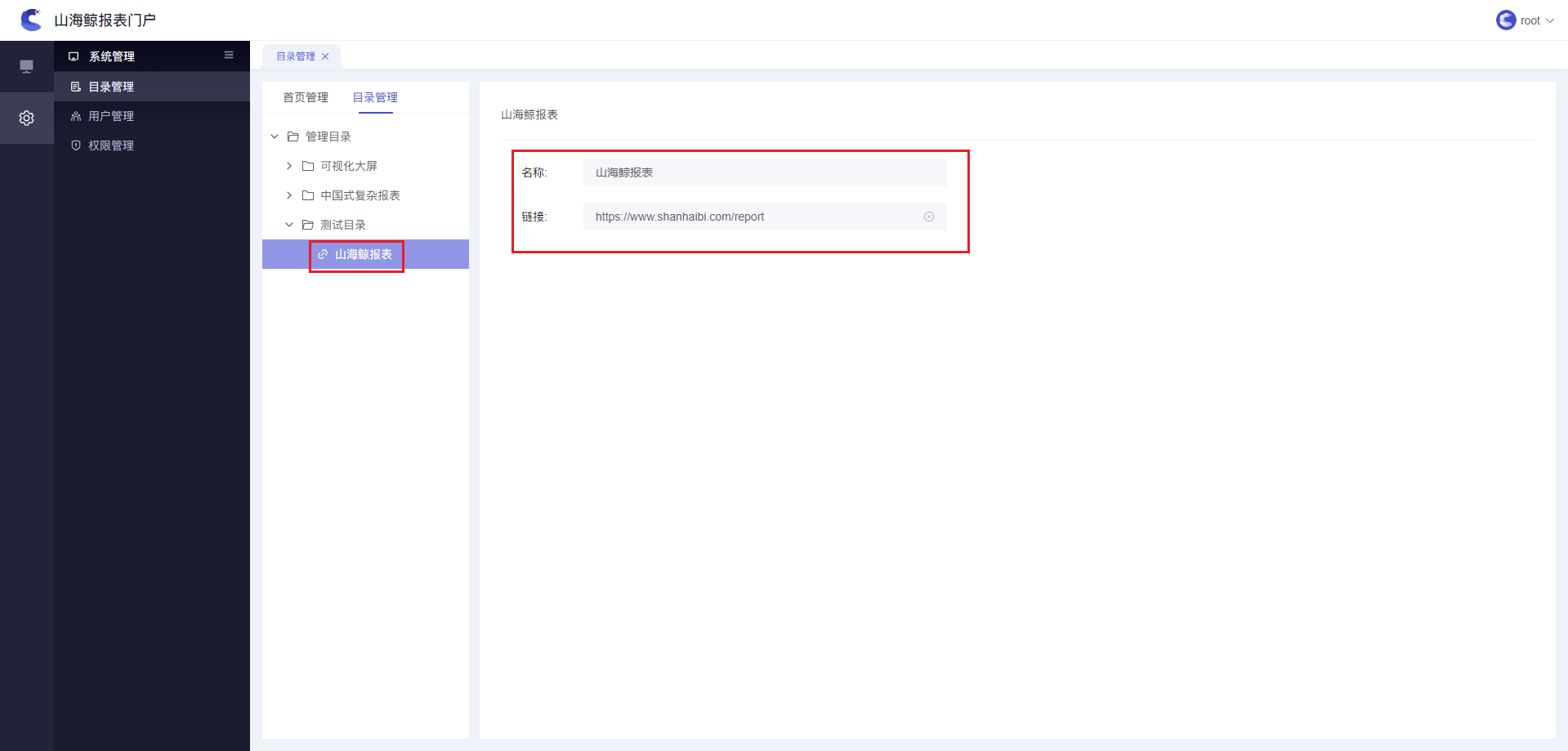1)选中“测试目录”,点击“新增链接”按钮,输入名称和链接地址,这里使用“山海鲸报表”进行演示,如下图所示: