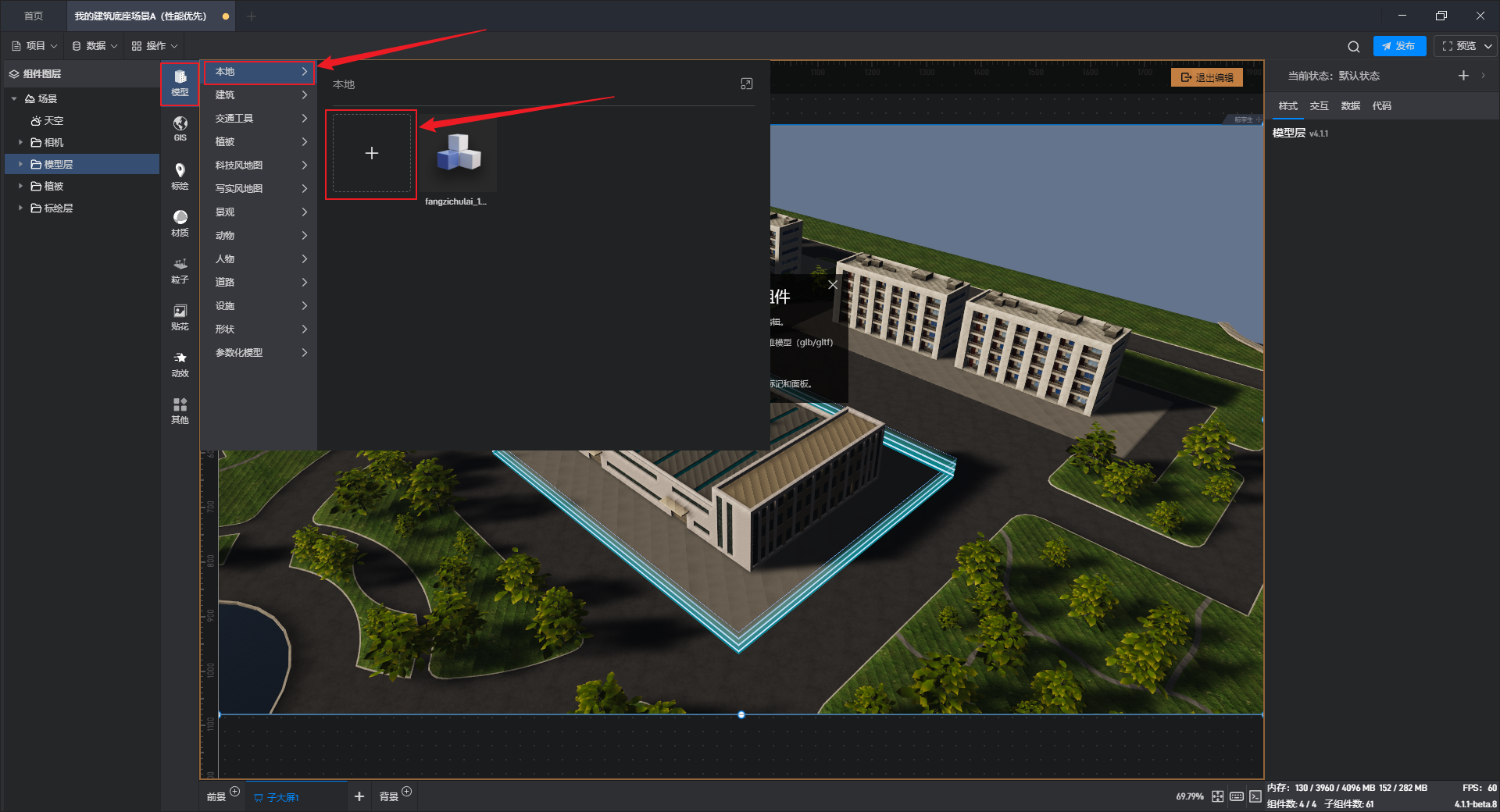 在鲸孪生编辑界面中点击左侧“模型”,在“本地”菜单栏中点击“+”即可导入模型文件。