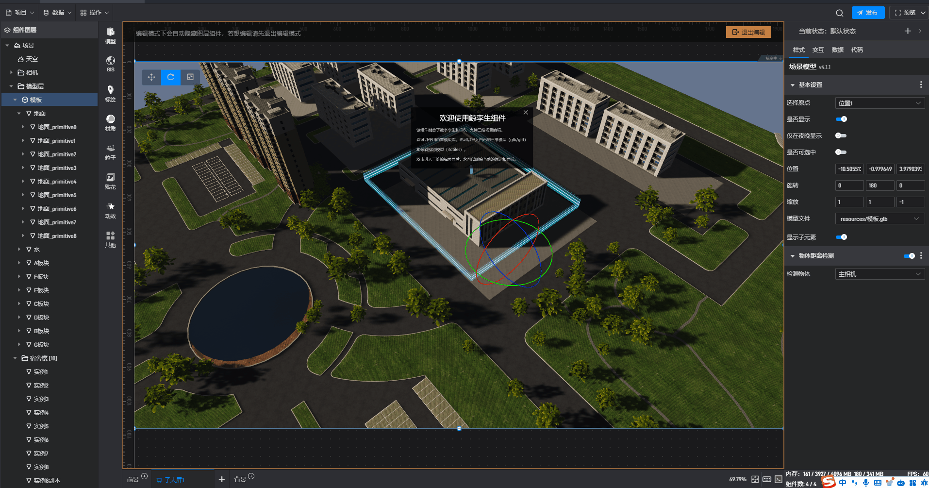 场景模型位置、旋转、缩放设置项支持选择按钮手动调整和修改具体数值调整两种方式,下面以旋转为示例进行演示: