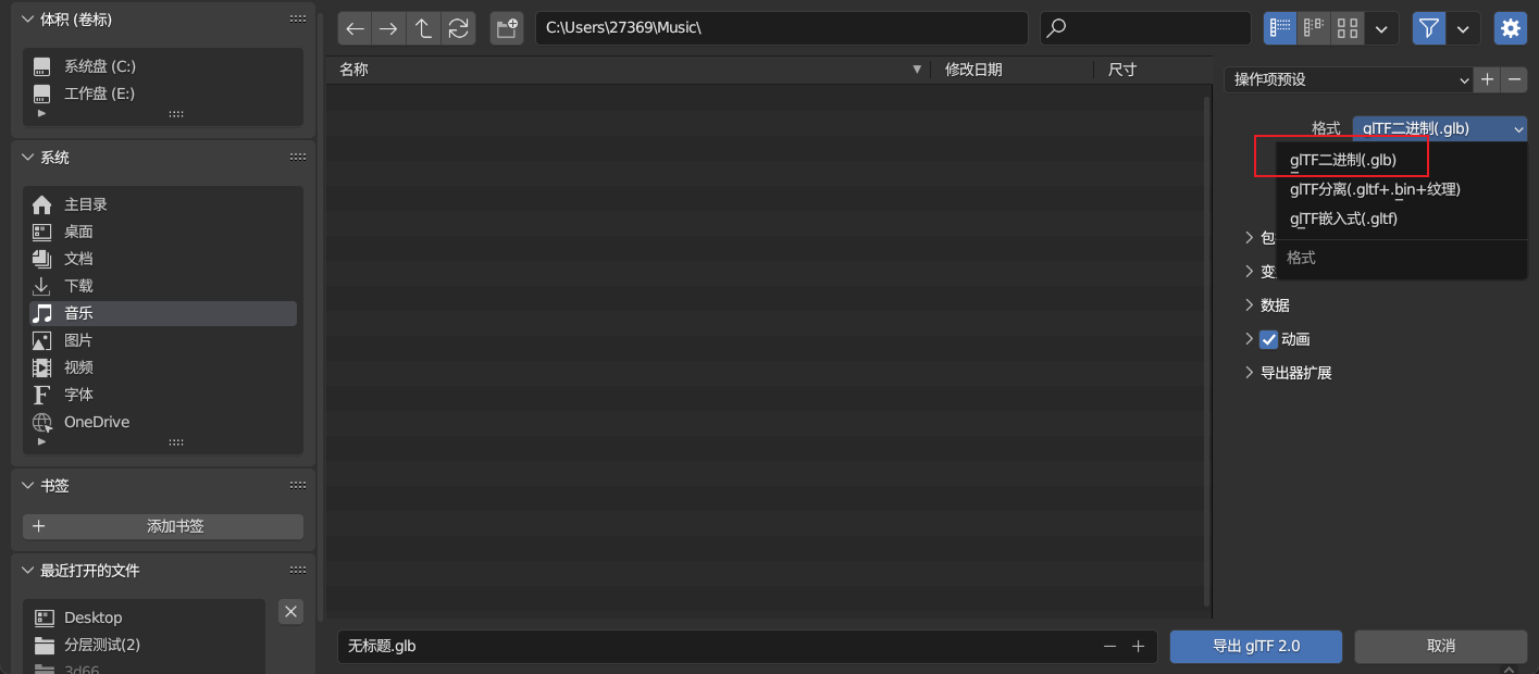 注意一定要选择这个 glTF 分离,因为只有选择这个才可以有 web 的渐进式加载和缓存优化。而 glTF 嵌入式则需要使用 glb 模式进行导入到山海鲸。