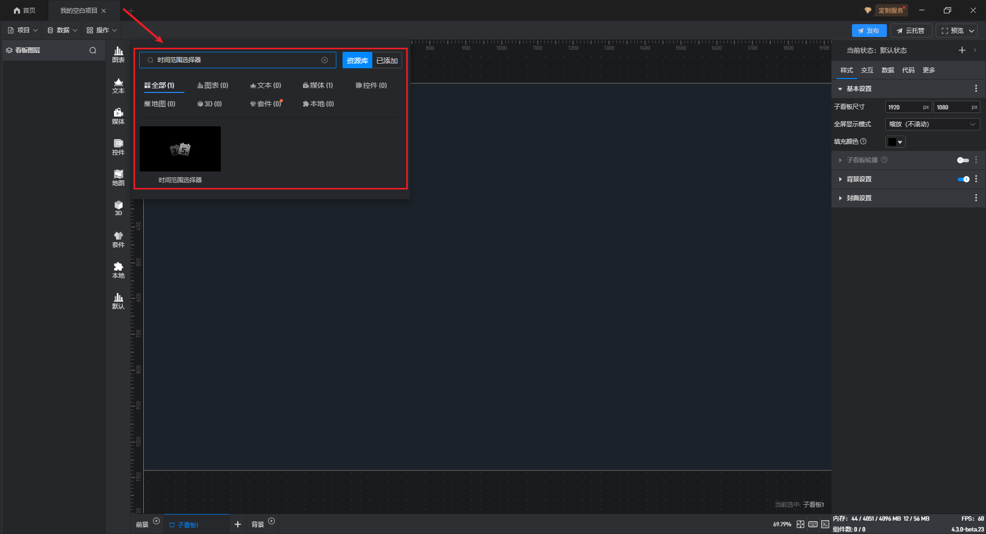点击搜索按钮或按键盘“Ctrl+F”键打开搜索框,输入组件名称进行搜索,然后点击对应的组件进行添加。