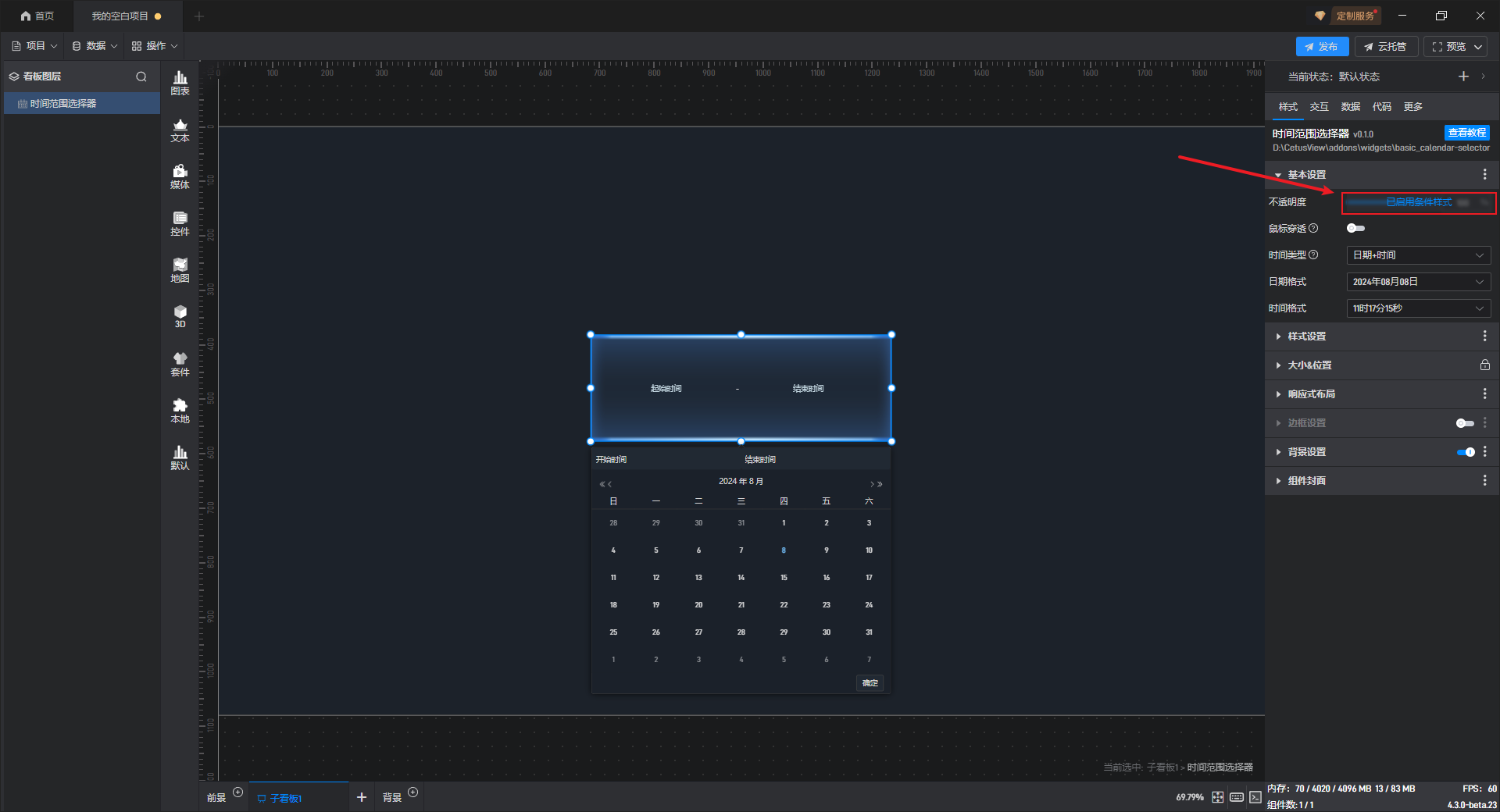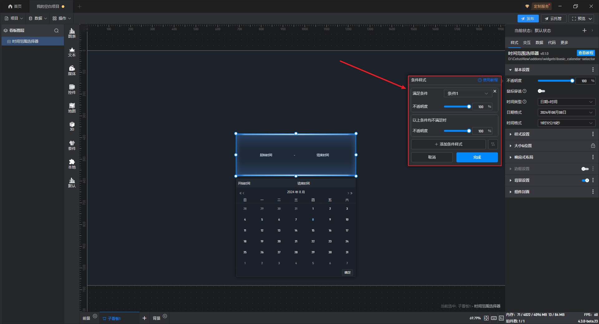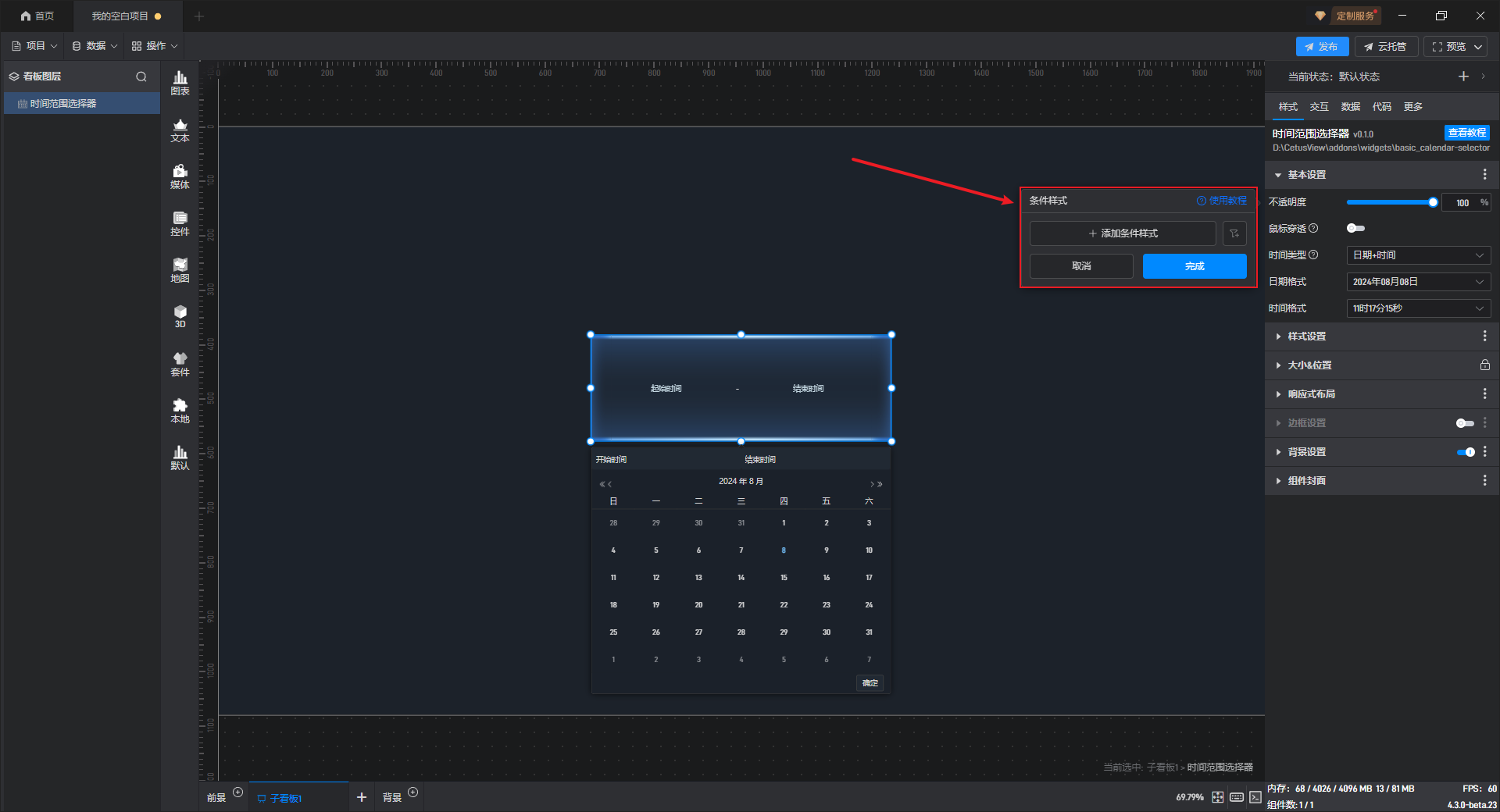 部分设置项的条件设置方式直接显示在该设置项中,可以直接在该设置项上设置,但时间范围选择组件的条件样式只能通过方式 1 进行设置。
