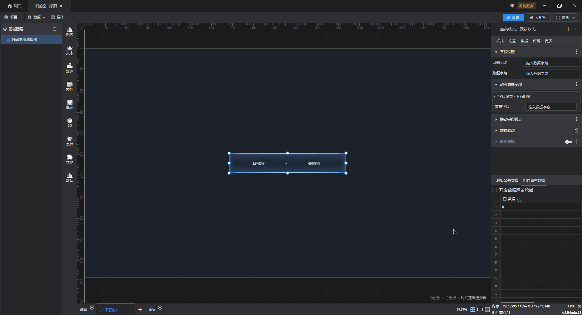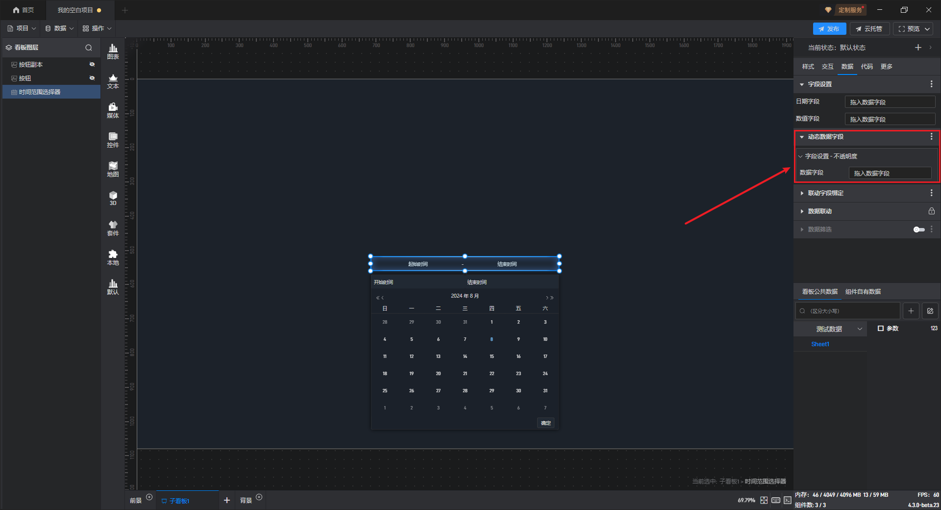添加一个数值为“0”的数据到数据字段中,可以看到通过动态数据字段将不透明度的数值修改为“0”,从而使组件隐藏。
