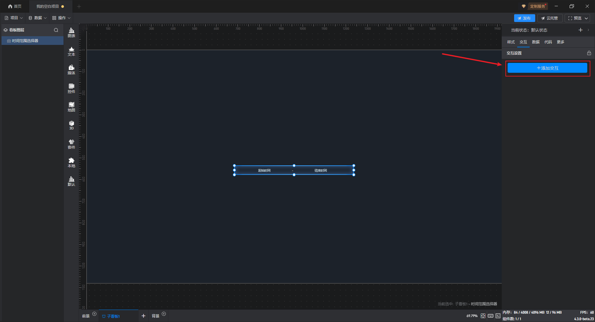 点击选中组件,在右侧“交互”设置窗口中可以对当前组件的交互进行添加和删除。