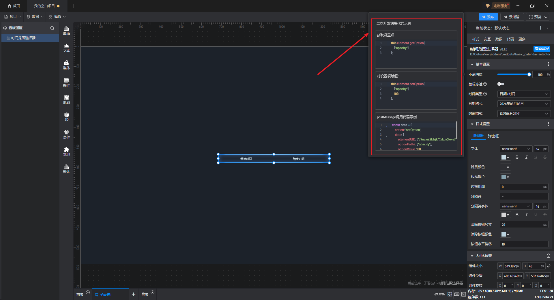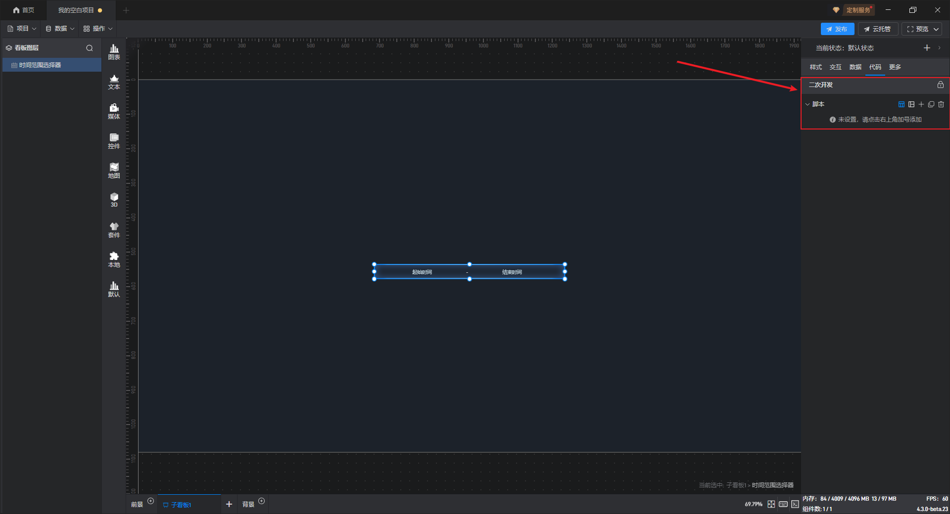 点击选中组件,在右侧“代码”设置窗口中可以对组件进行二次开发设置。