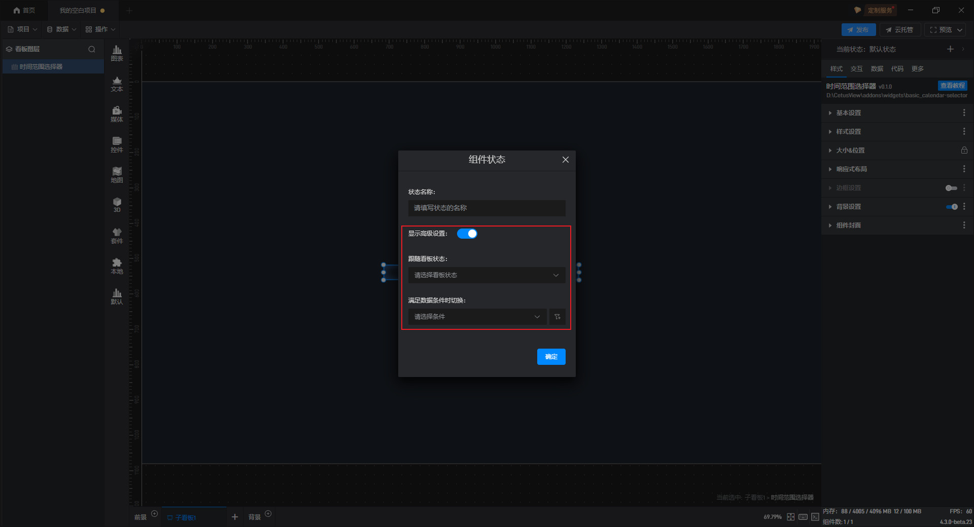 在这里我们可以选择已设置的数据条件,从而在数据条件满足时,组件的状态就会发生变化。