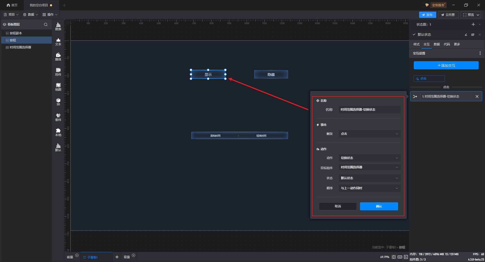 为显示按钮组件添加一个交互,点击后切换组件到默认状态(显示状态)。