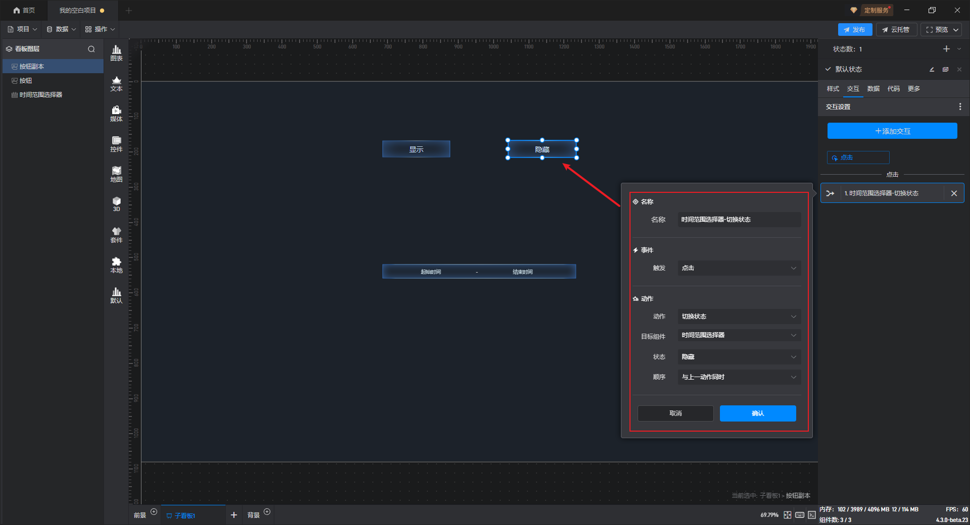 给隐藏按钮组件添加一个交互,点击后切换组件到隐藏状态。