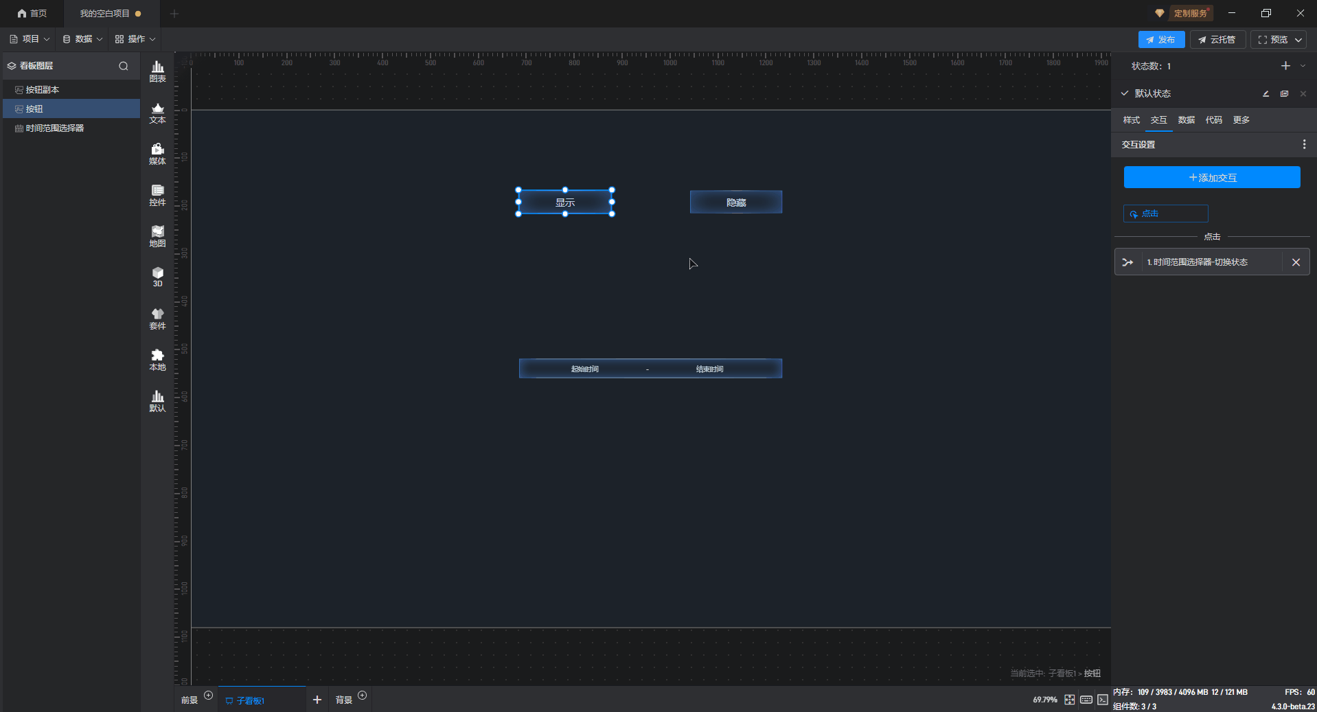 多状态主要用于通过数据条件或是点击交互(通常是点击其他组件来触发本组件的状态切换)来切换组件设置项的场景,这里的设置项包括组件的样式、交互、数据和代码。