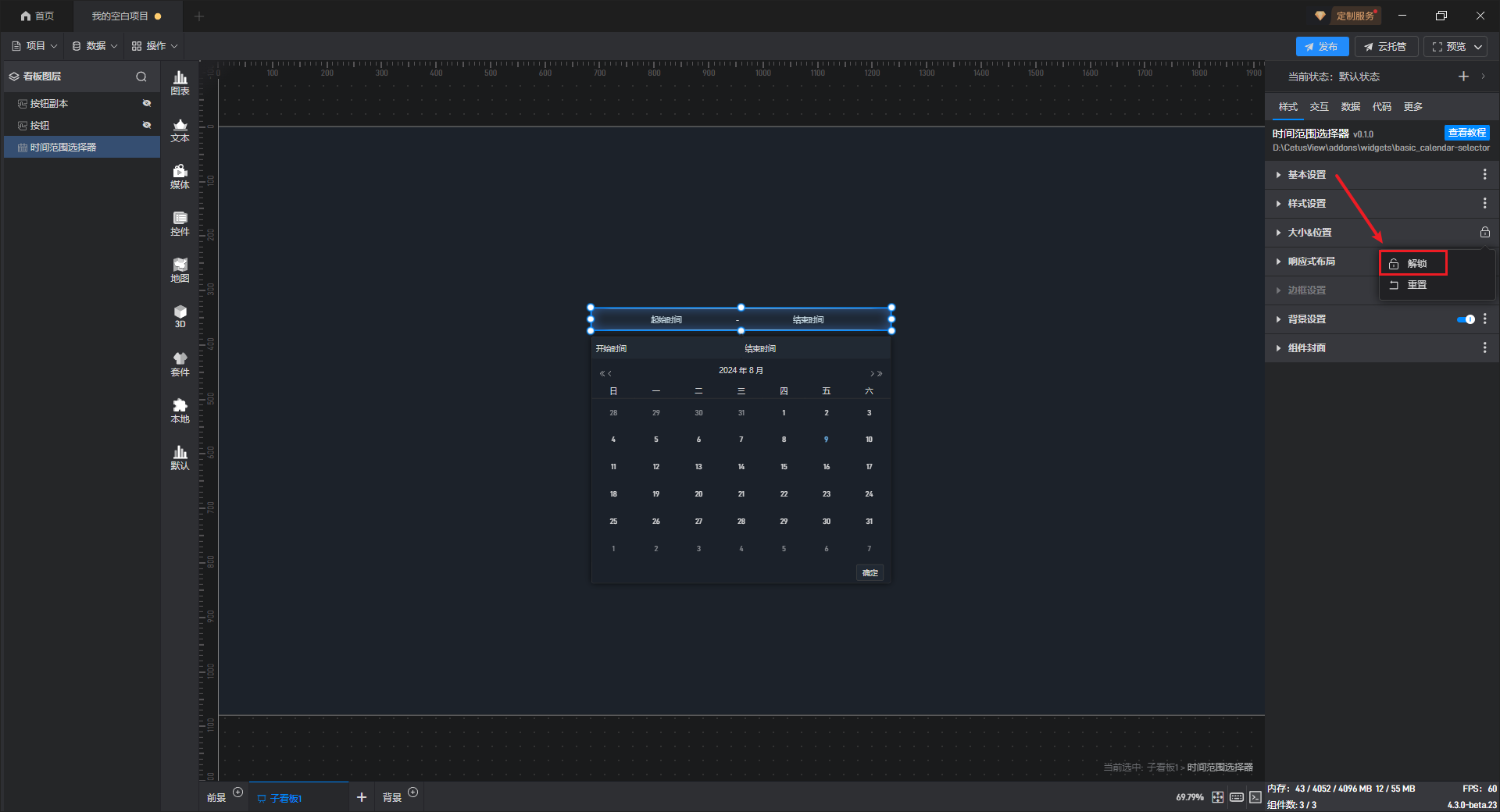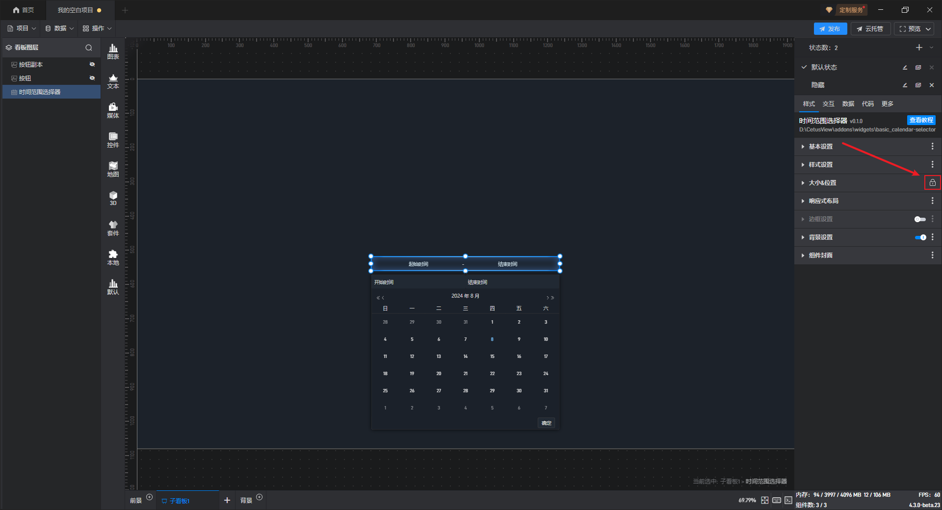 可以通过直接点击和拖动组件来调整大小和位置,也可以通过直接输入宽、高、X 坐标和Y 坐标来设置。