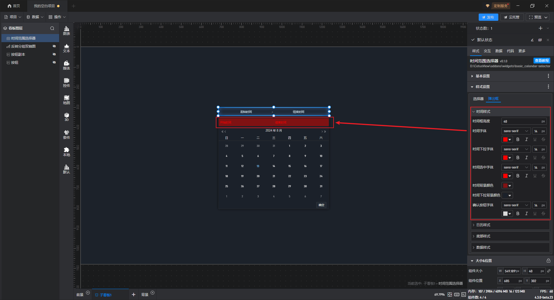 可以在此处自定义修改时间框“开始时间”、“结束时间”的样式,比如时间框的高度,字体颜色,字体被选中时的颜色和时间框的背景颜色等。