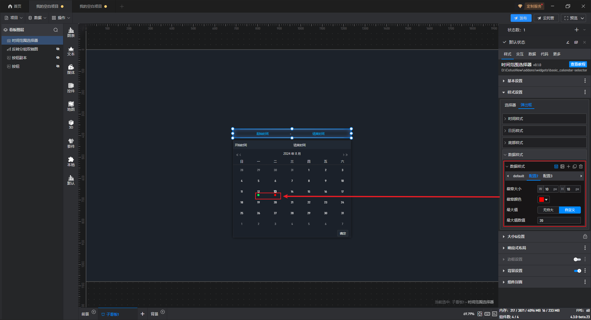 在此处可以自定义修改数据样式,比如修改徽章的大小、颜色以及最大值,点击“添加”按钮可以添加一个数据配置。常见用途:根据数值大小,用不同颜色标识对应日期,类似空气质量指数。
