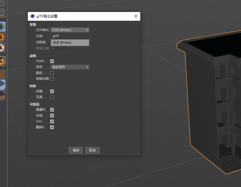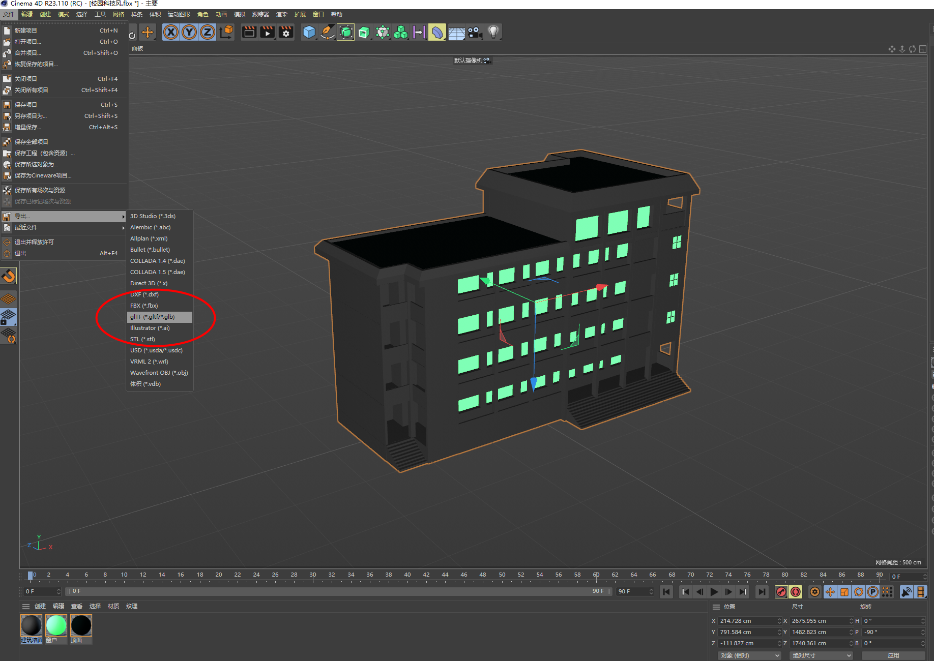 将 Cinema 4D R23 模型保存为gltf或glb文件格式导出(这里我们先选择 glb)。