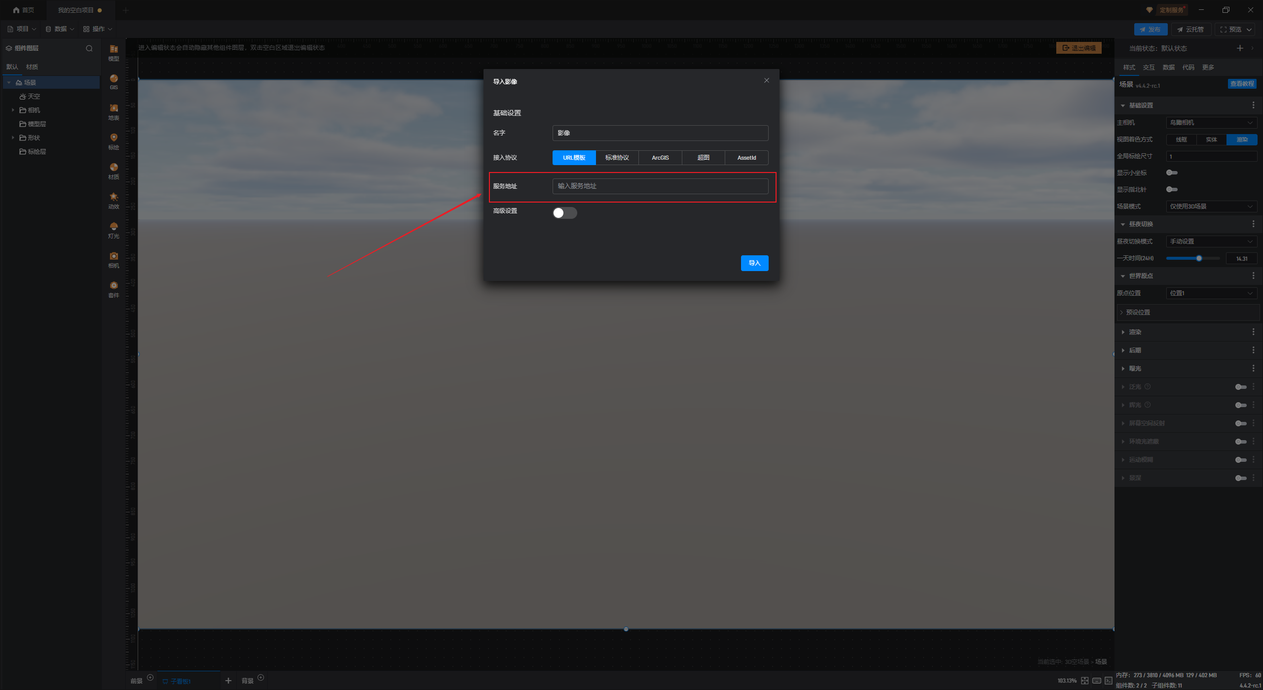 1)山海鲸可视化软件鲸孪生编辑模式下,在 GIS 服务中点击“+”添加影像。