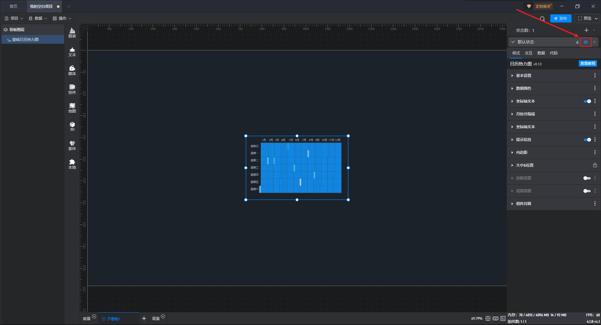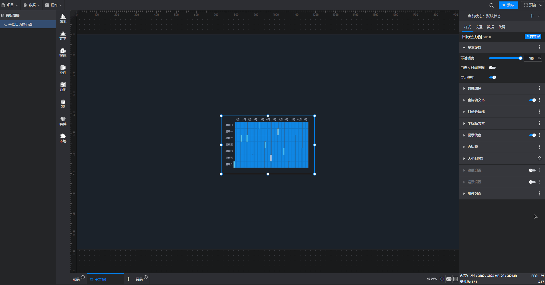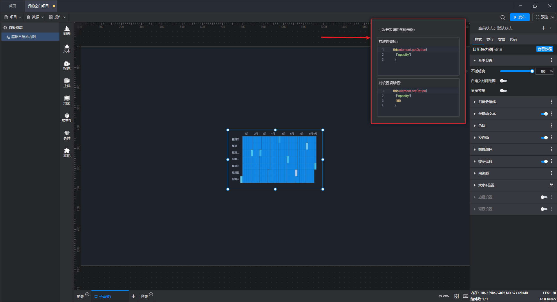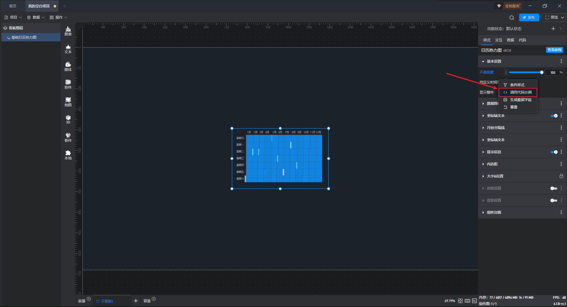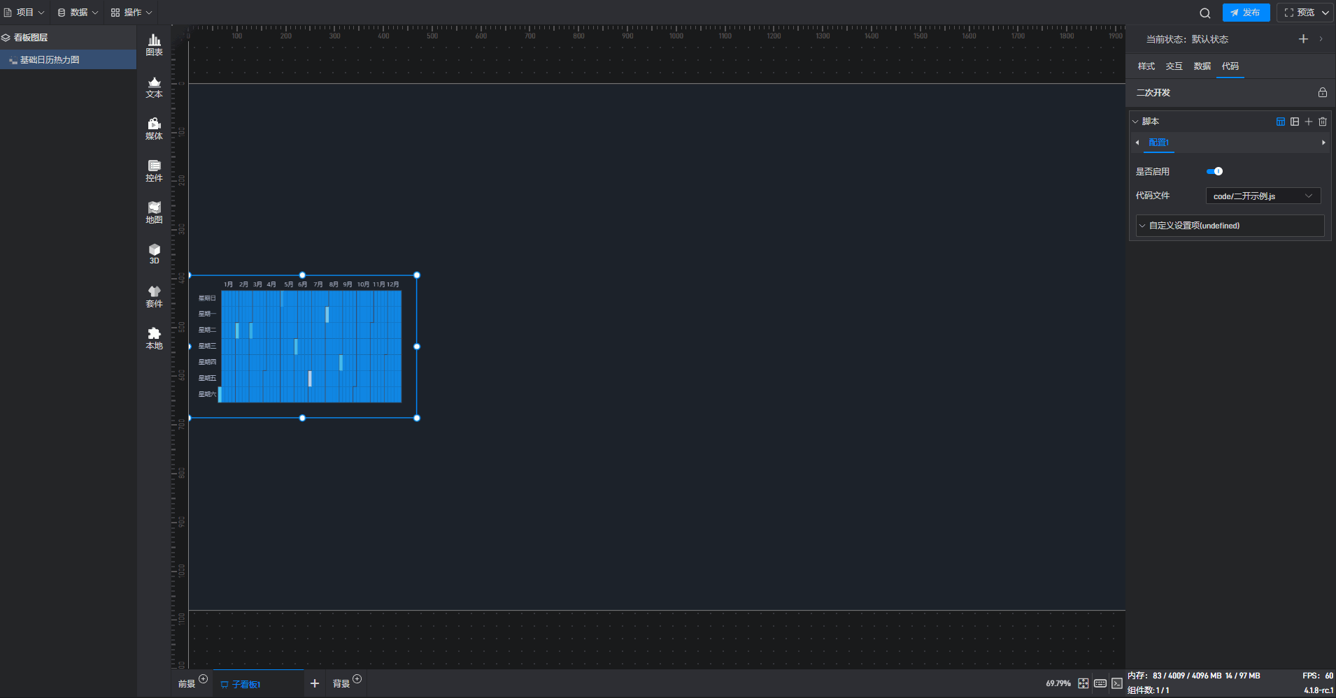 下面我们以基础日历热力图为例,为大家介绍一下组件的使用步骤: