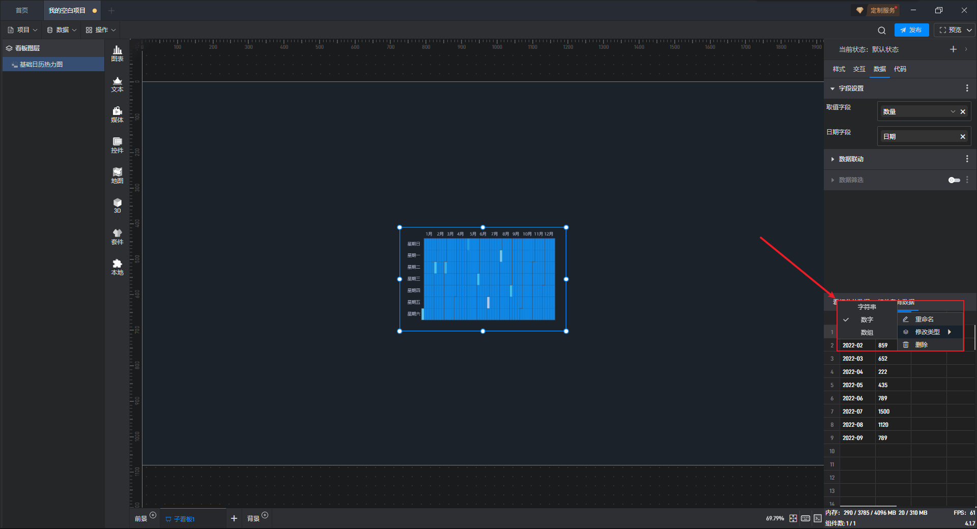 字段类型包括:字符串、数字和数组(日期字段是字符串类型,取值字段是数字类型,数组类型用于词云组件),只有在字段类型正确的情况下,组件内容才能正常显示。
