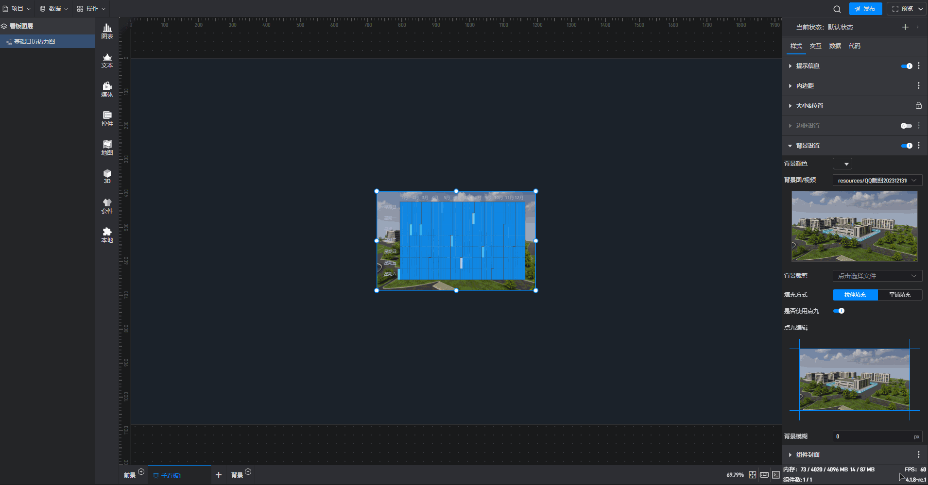 | 背景图/视频 | 可在此处添加本地图片或视频,充当组件背景。 |