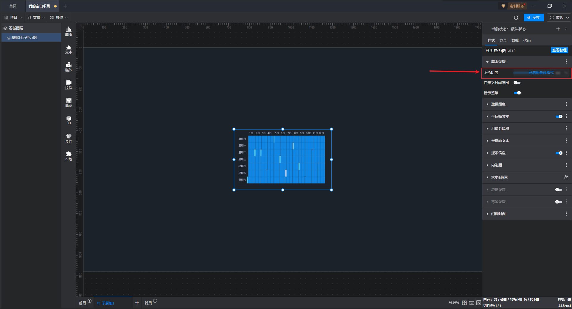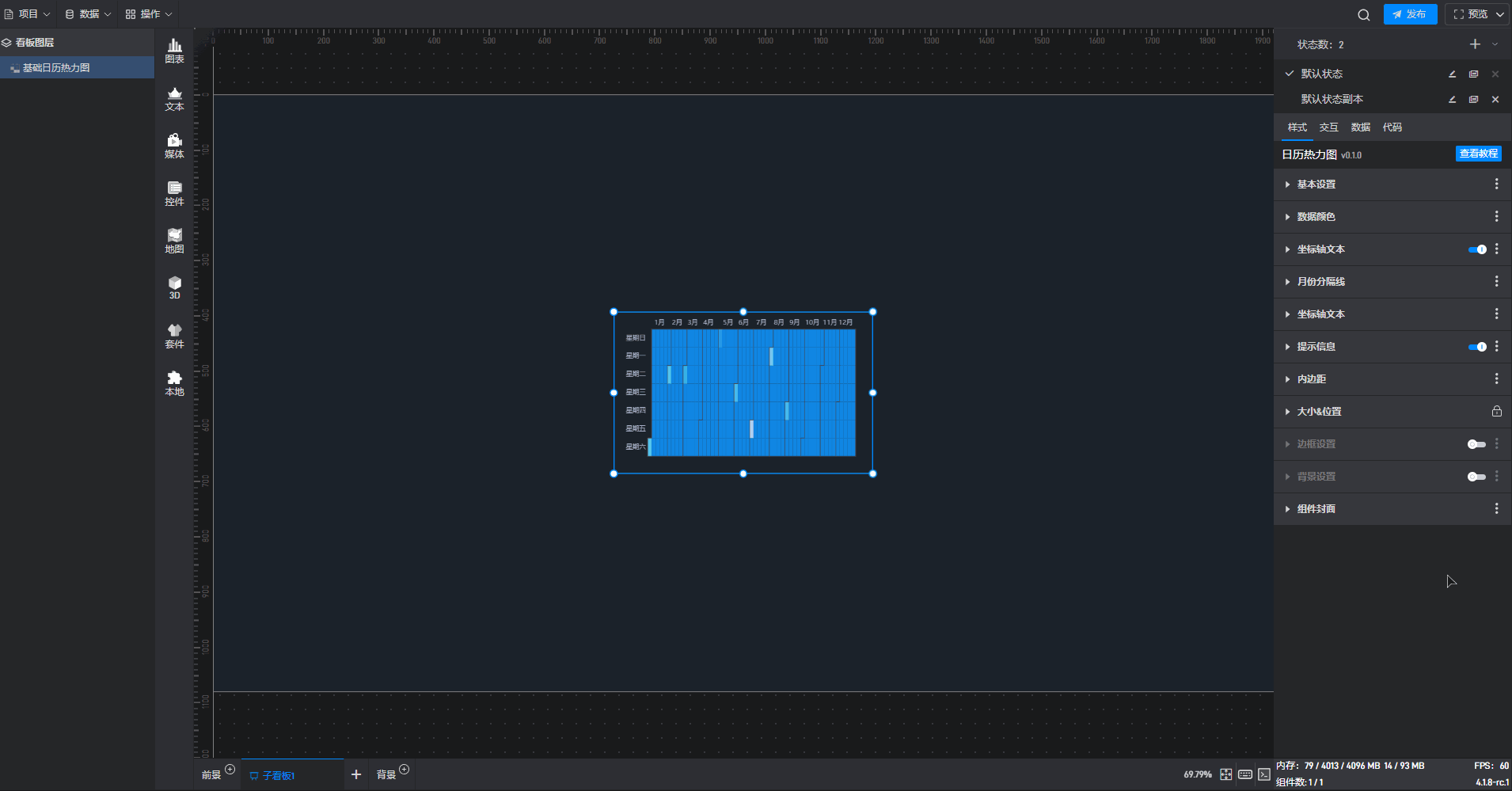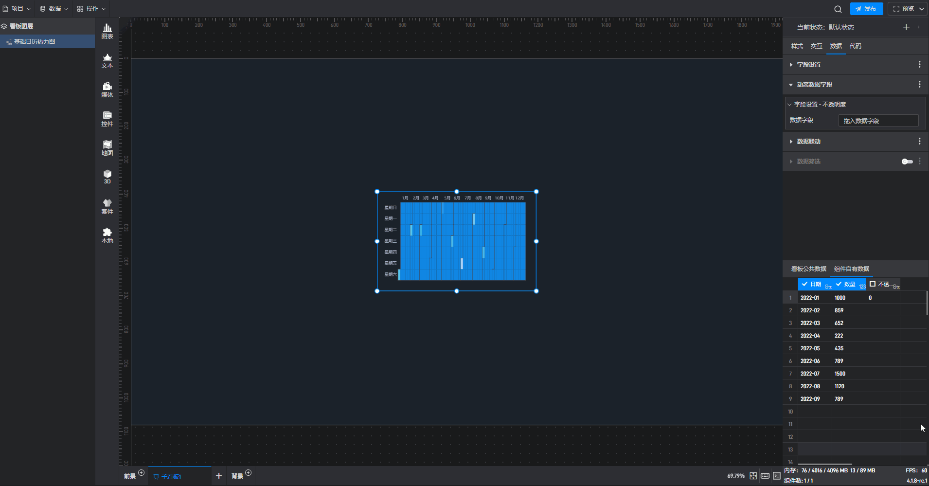 基础日历热力图是热力图组件的一种预设样式,预设的样式主要包括组件自有数据、图形形状、颜色和数量,但是本质上这种组件是热力图。
