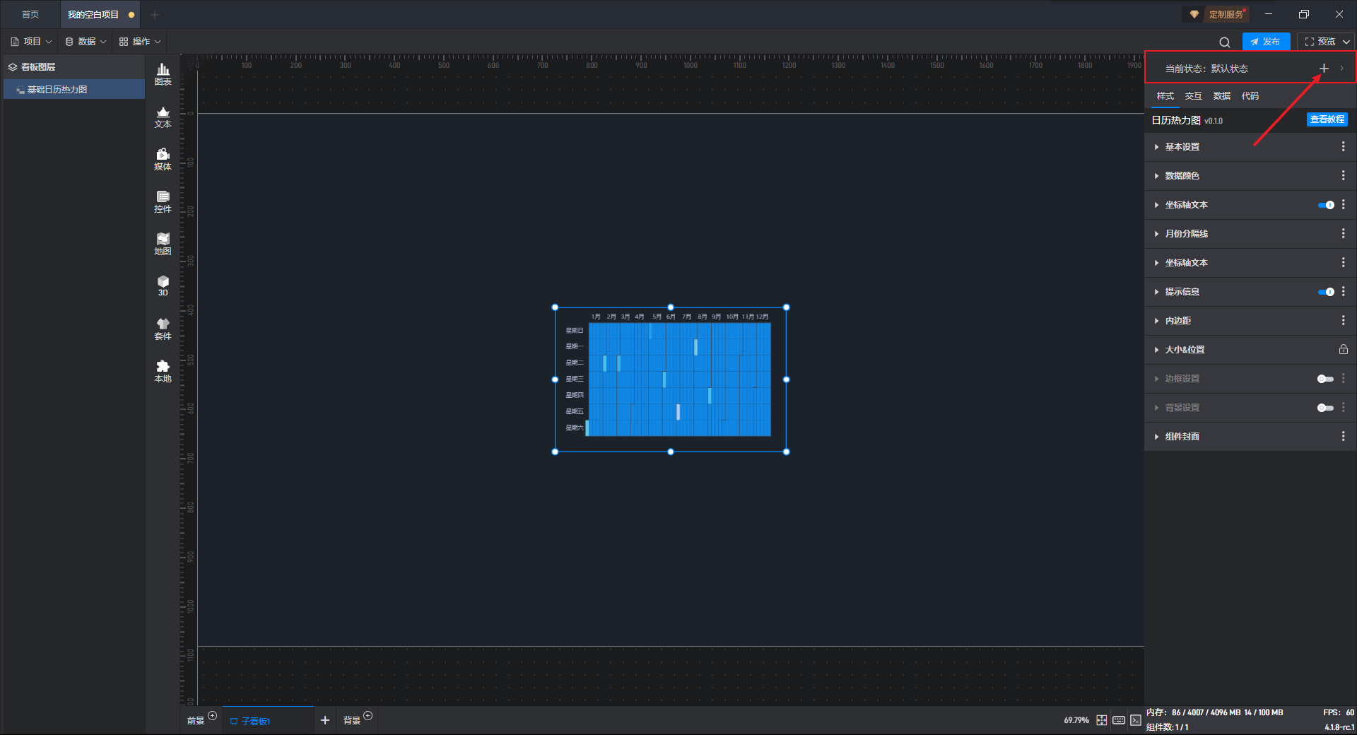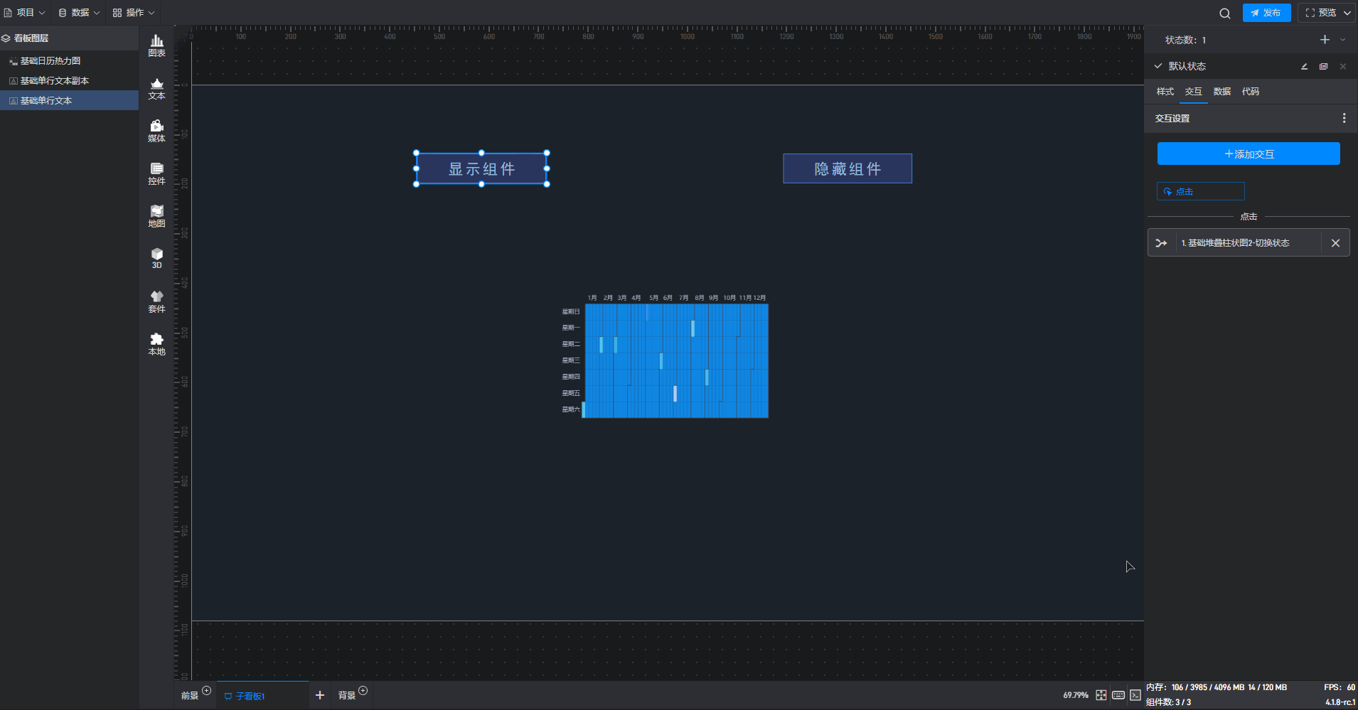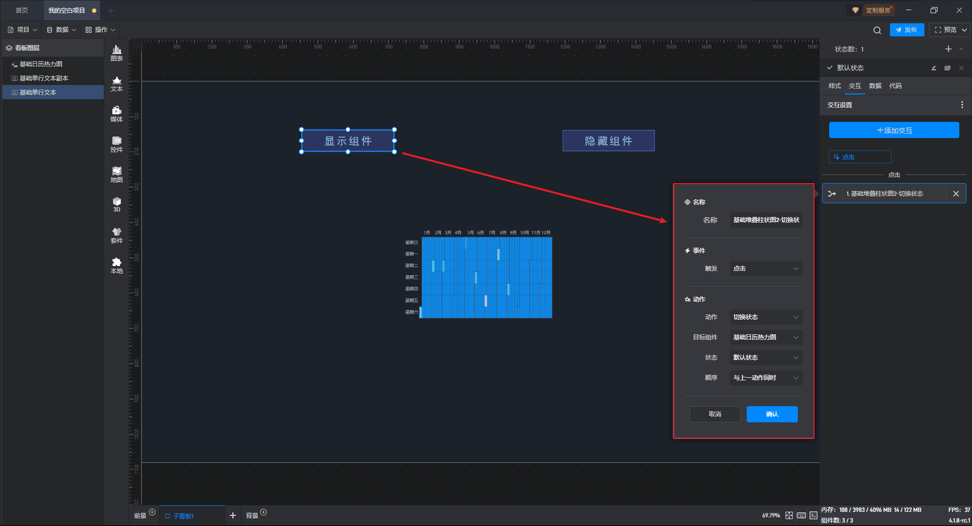 接下来我们给显示按钮组件添加一个交互,点击后切换基础日历热力图组件到默认状态(显示状态)。