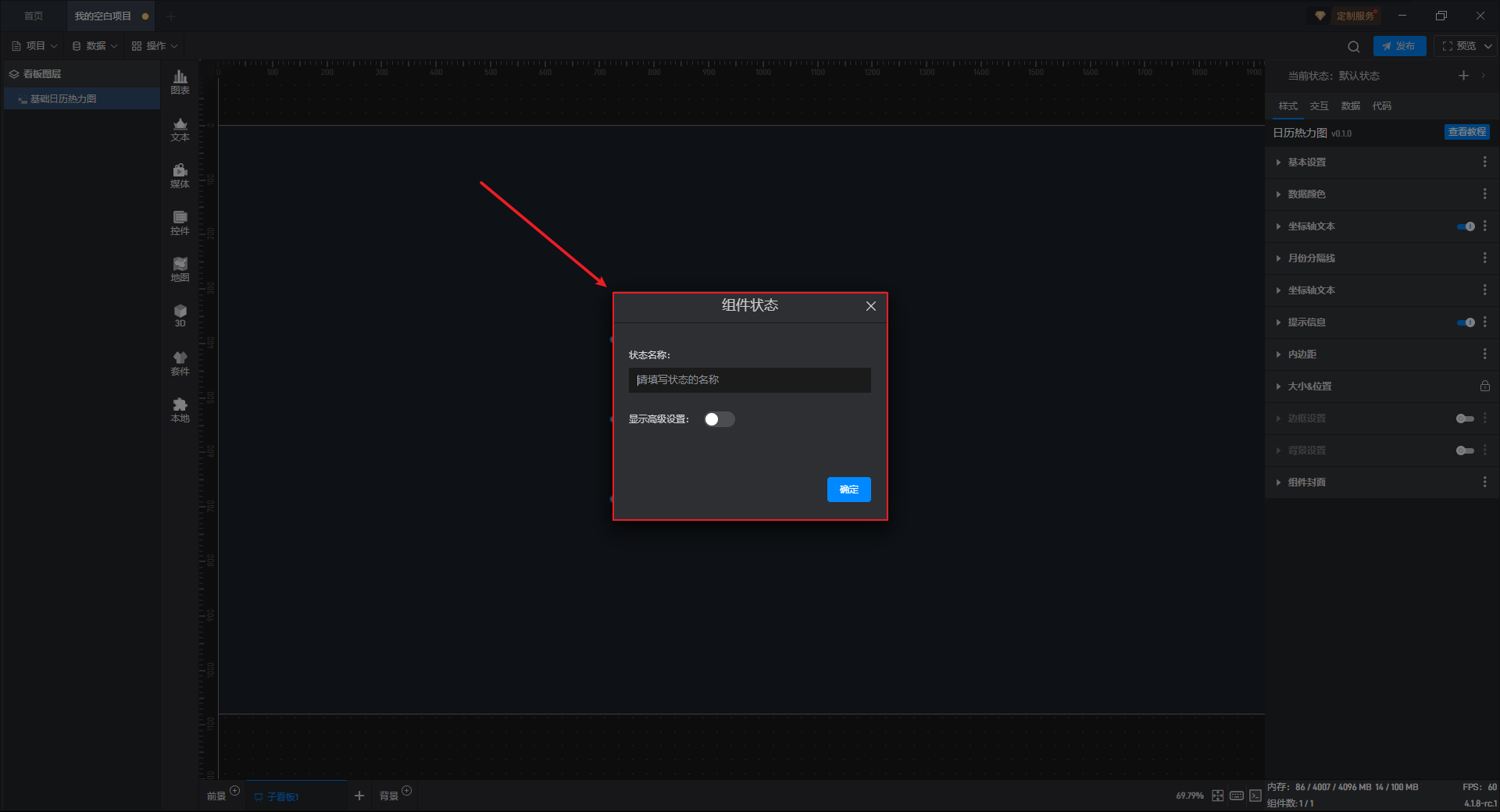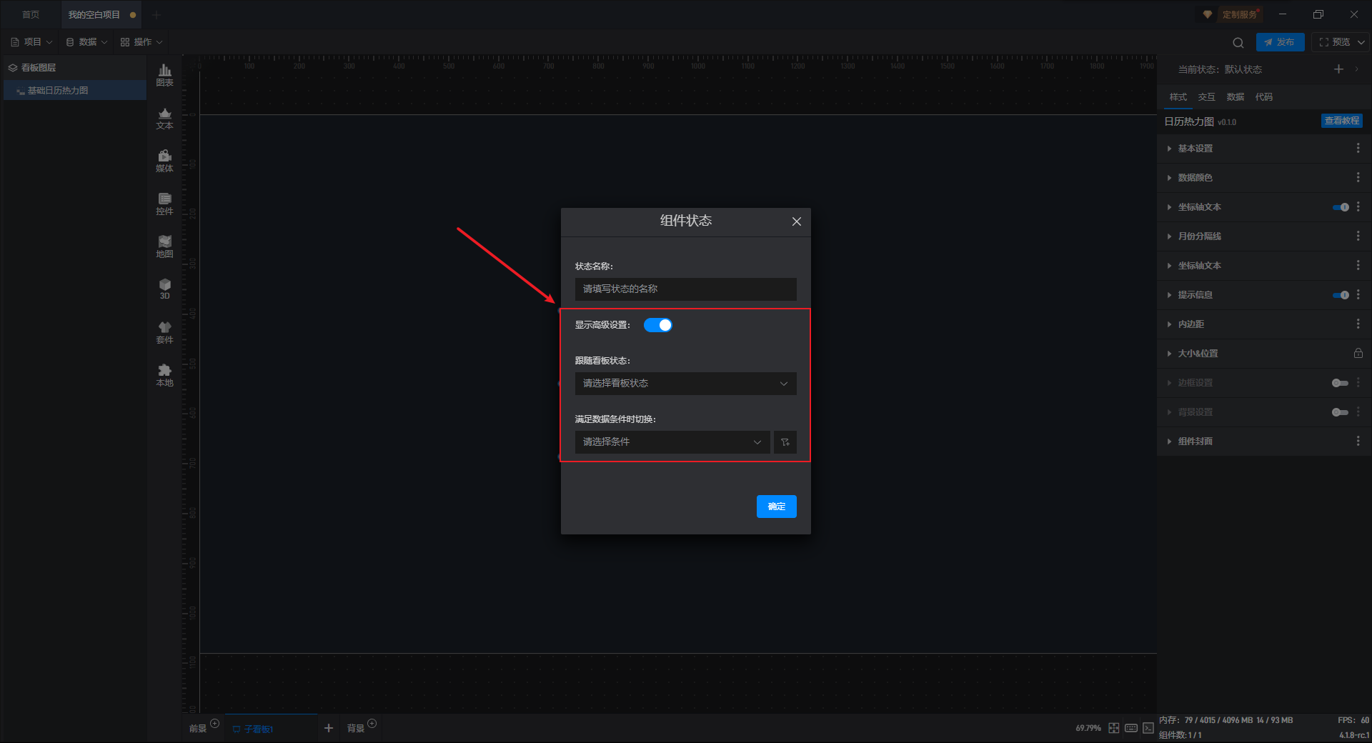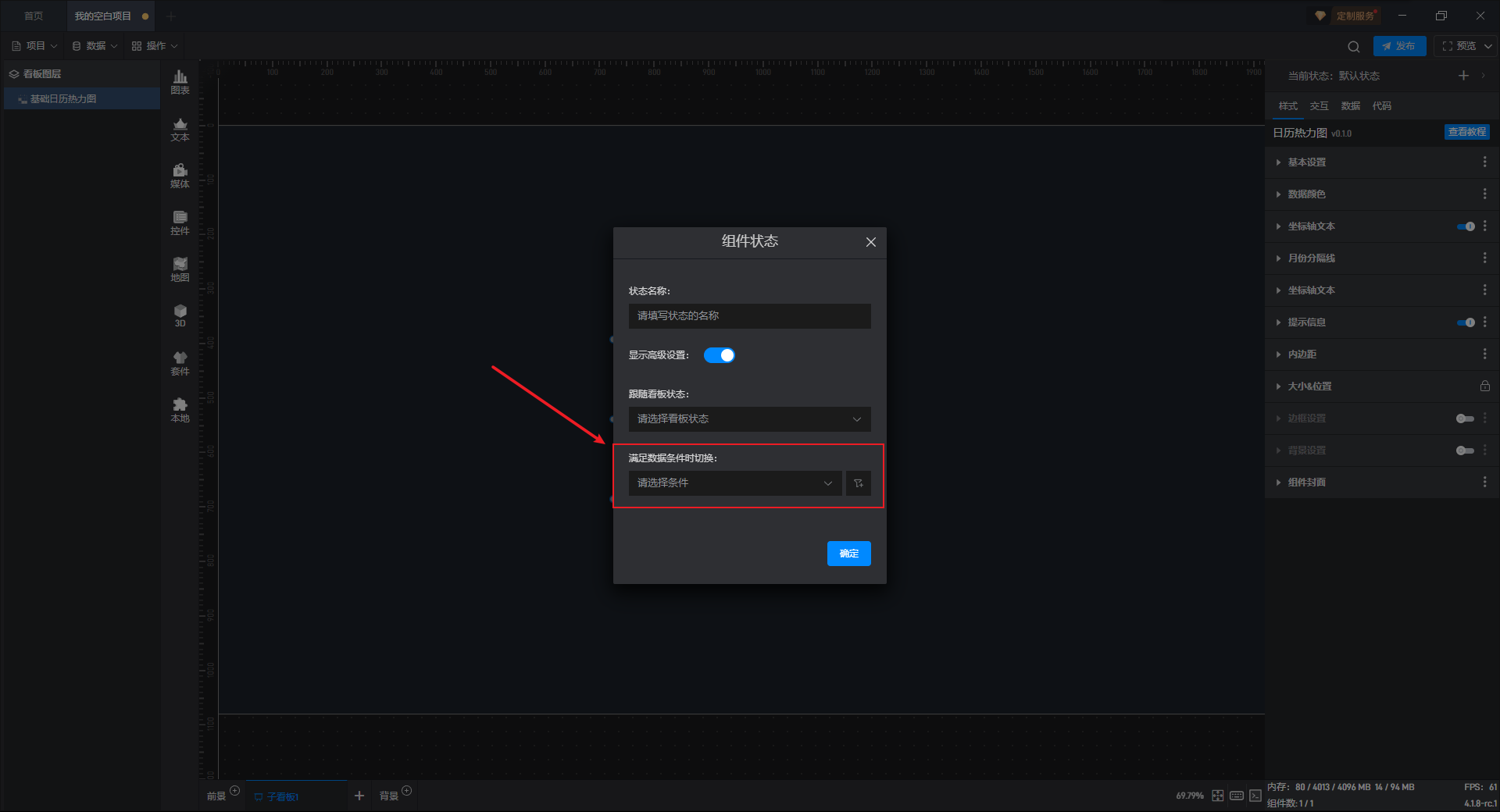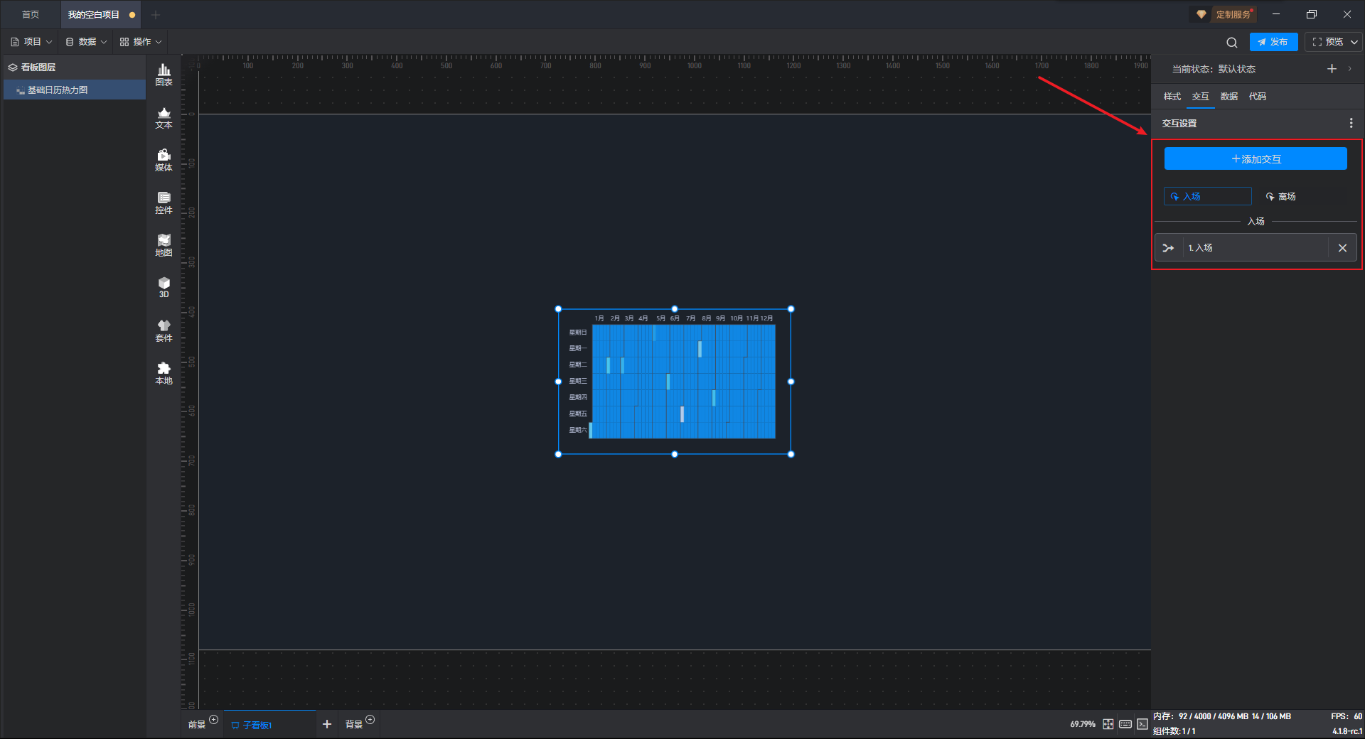 接下来我们给显示按钮组件添加一个交互,点击后切换基础日历热力图组件到默认状态(显示状态)。