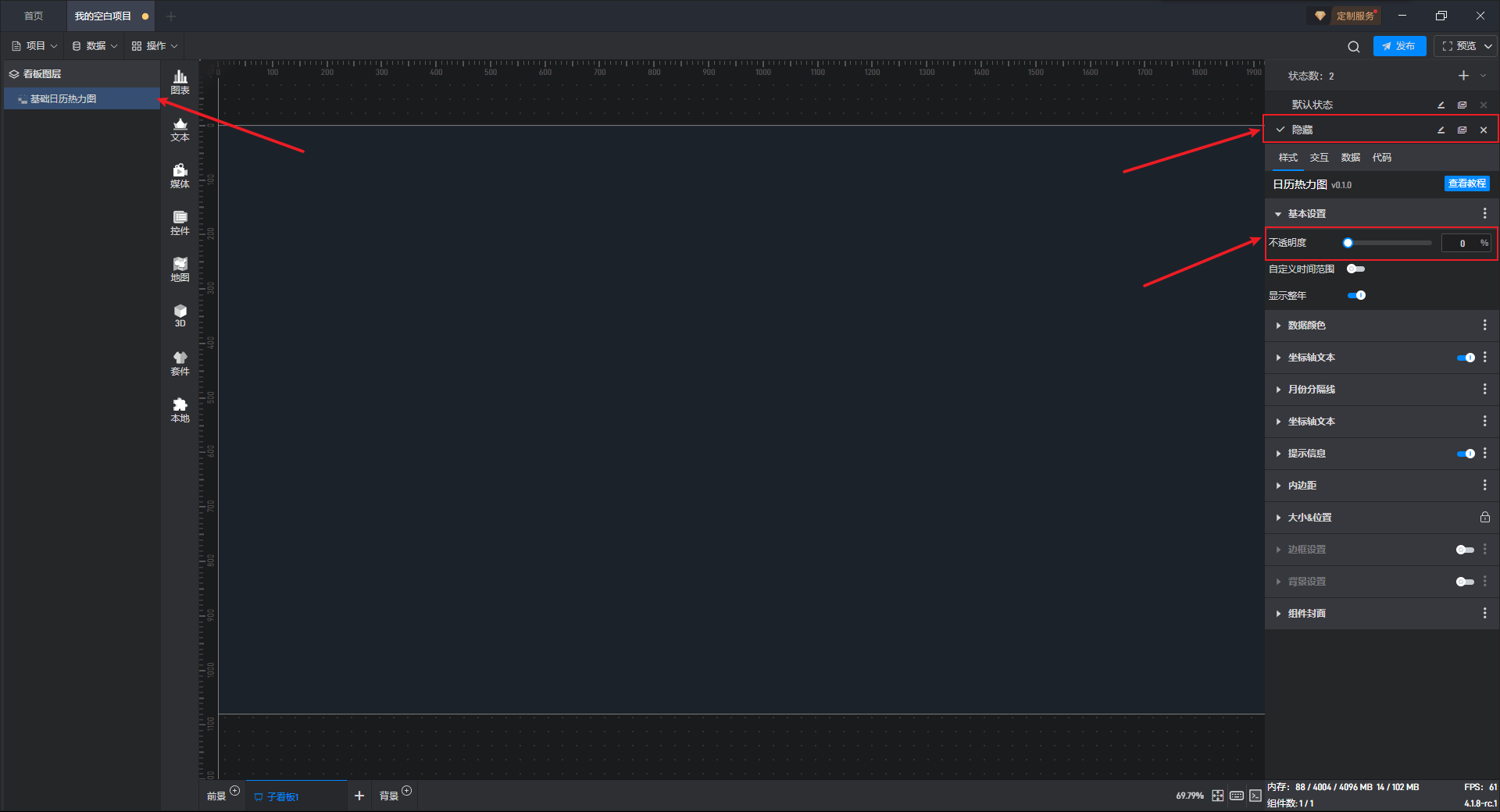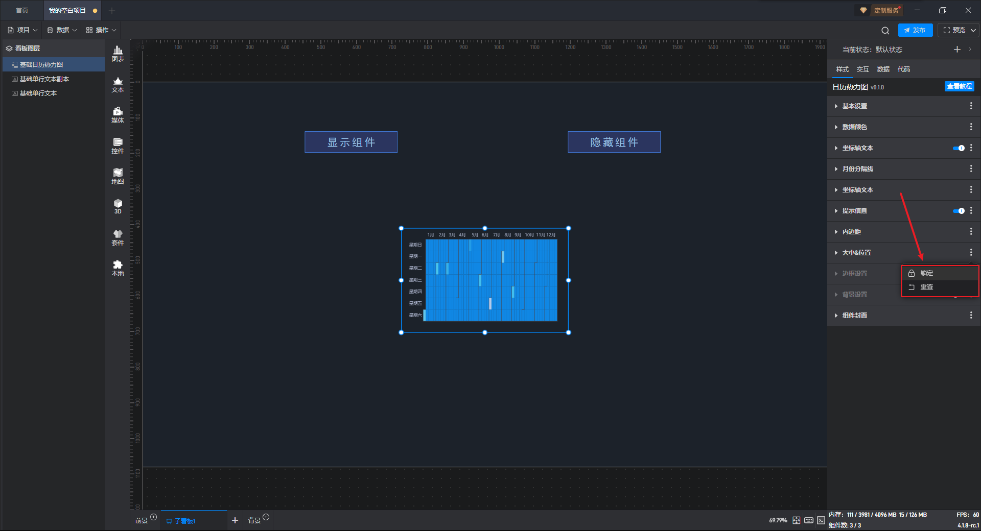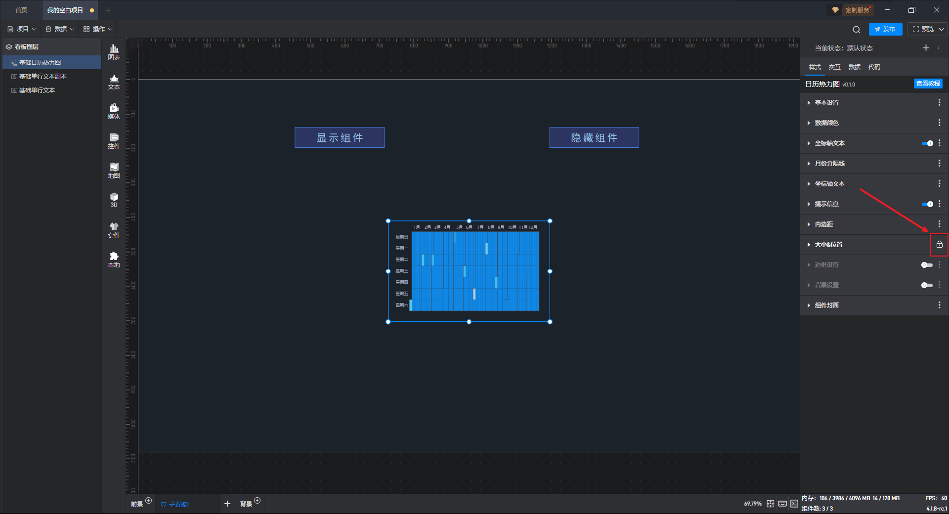 给隐藏按钮组件添加一个交互,点击后切换基础日历热力图组件到隐藏状态。