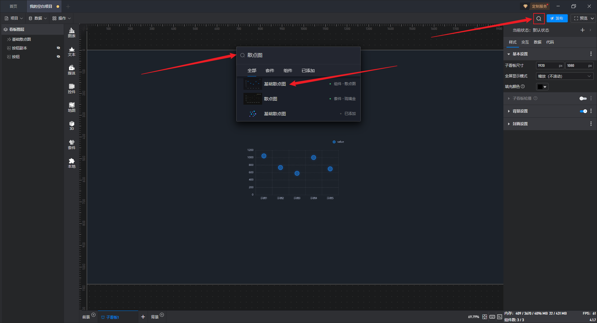 点击搜索按钮或按键盘“Ctrl+F”键打开搜索框,输入组件名称进行搜索,然后点击对应的组件进行添加。