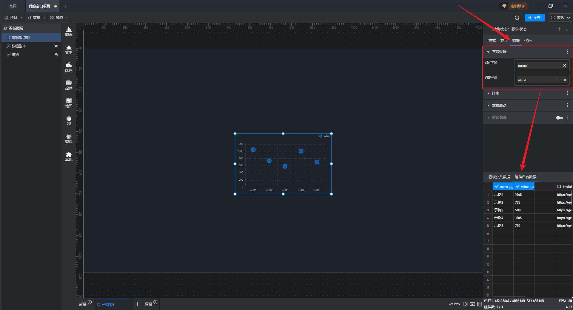 单击选中组件,在右侧“数据”设置窗口中,可以看到组件已经设置好了数据字段,且数据字段来自于“组件自有数据”。